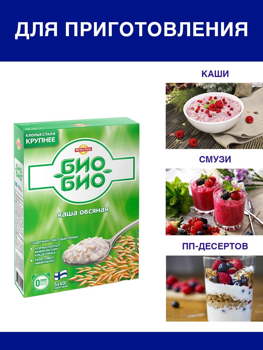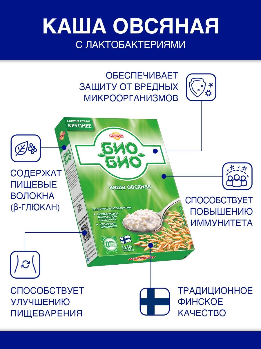| Состав | Хлопья овсяные, сахар, соль йодированная, комплекс «Био-Био» (хлопья овсяные, пробиотические лактобактерии Enterococcus faecium L-3). Продукт содержит глютен, может содержать следы лактозы. |