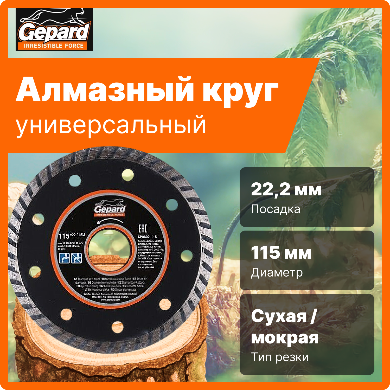 Круг алмазный 115х22 мм GEPARD Turbo () применяется для сухой и мокрой резки гранита, кирпича, бетона, строительного камня, тротуарной плитки и других твердых материалов. Имеет косую насечку по боковым сторонам обода, за счет чего увеличивается механическая прочность, а также повышается уровень отвода тепла при работе. Обеспечивает ровный, аккуратный и быстрый рез бетонных поверхностей. Режущая часть выполена методом холодного прессования. Высокий ресурс использования обеспечивается улучшенным качеством алмазных зерен и оптимально подобранной металлической связкой. Охлаждение водой увеличивает ресурс круга.