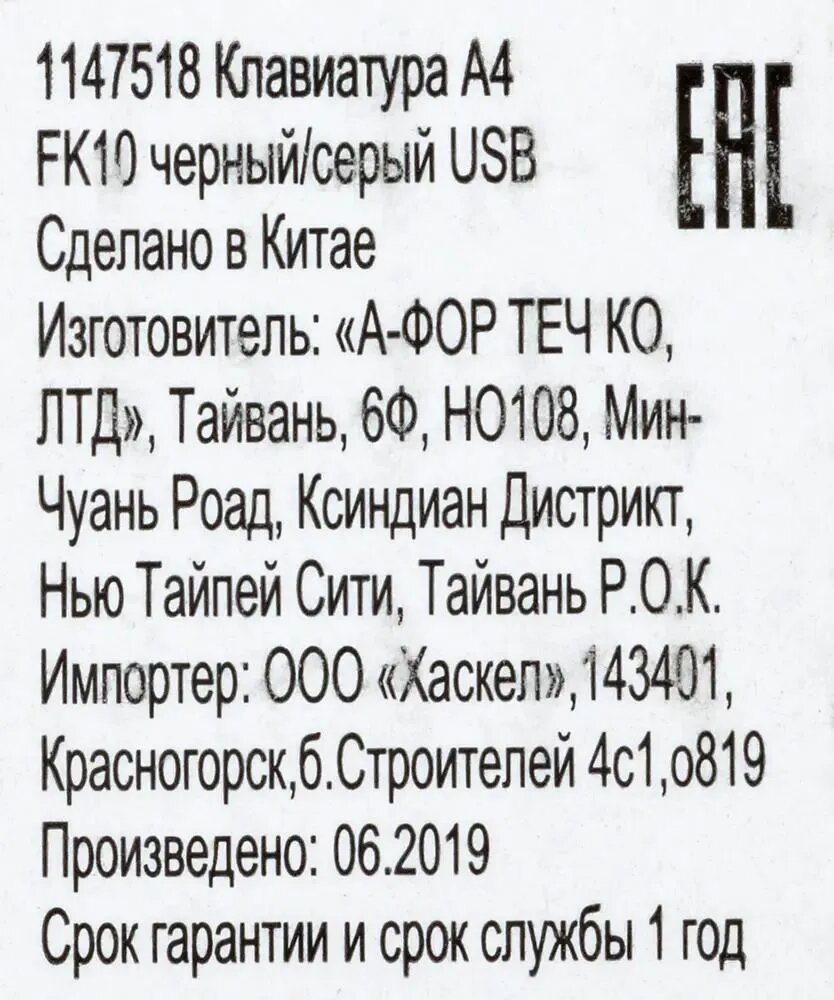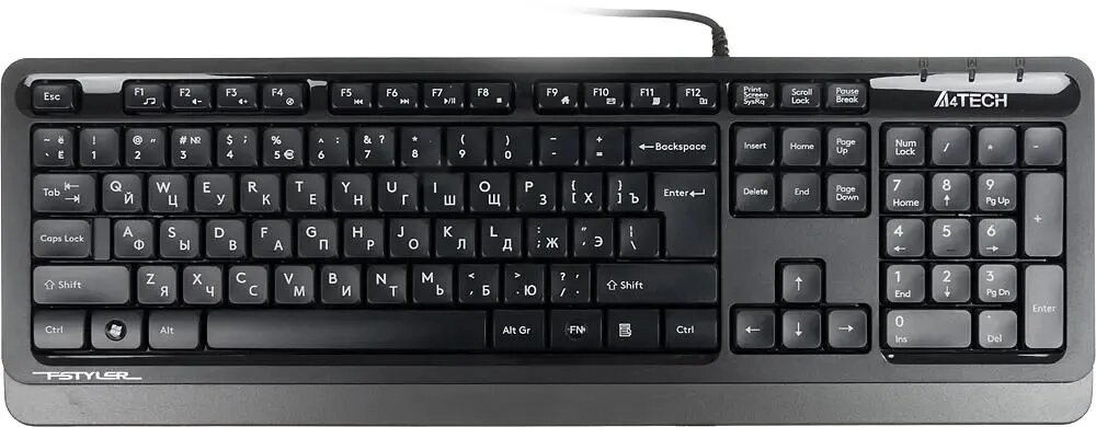 Доступная по стоимости клавиатура A4 Fstyler FK10 подключается к компьютеру посредством USB-порта. Длина кабеля составляет 1.5 м. Клавиши обладают квадратной формой, обозначения английских и русских букв выполнены белым цветом. Имеются дополнительные мультимедийные клавиши. Плюсом модели становится то, что производитель оснастил ее защитой от попадания внутрь жидкости.