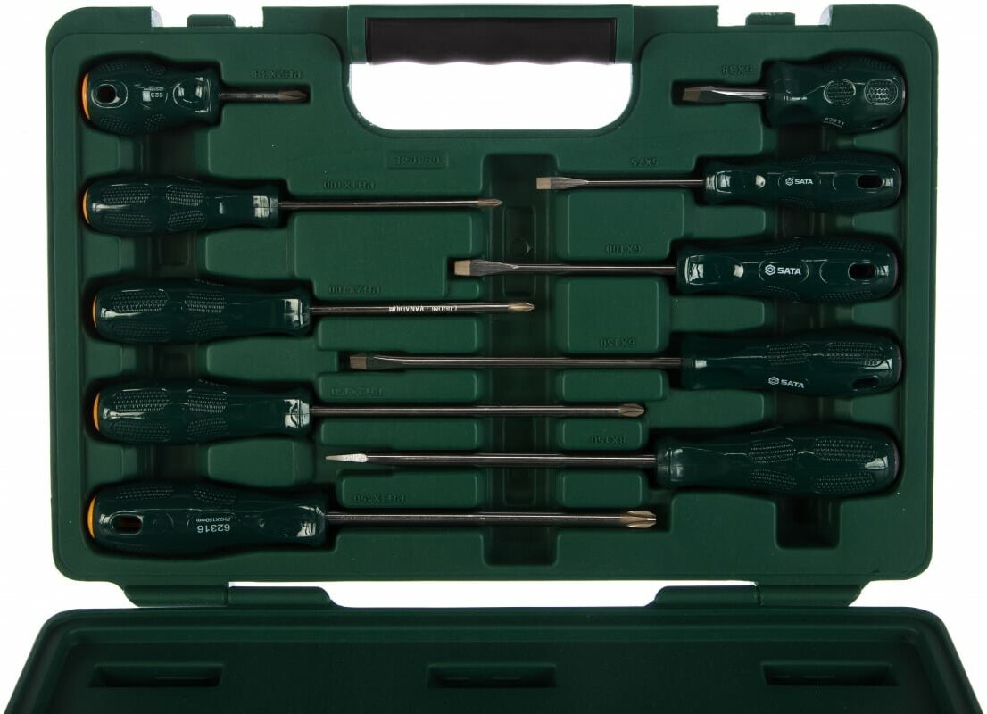 Комбинированный набор крестовых и плоских отверток 10шт серия А Sata E удобен для монтажно-демонтнтажных работ в бытовых условиях и в профессиональных ремонтных мастерских. Инструменты обладают продолжительным сроком службы, их стержни полностью выполнены из закаленной легированной хромованадиевой стали высокой прочности. Наконечники отличаются высокой точностью изготовления. Рукояти отверток имеют уникальную текстуру для более крепкого обхвата в процессе выполнения крепежных операций без риска проскальзывания ладони мастера. Ацетатные ручки максимально прочны и устойчивы к ударам. Для удобства хранения и транспортировки представленного комплекта предусмотрен надежный закрывающийся кейс с отдельными ячейками для каждого компонента.Закрывающийся кейс для хранения комбинированного набора крестовых и плоских отверток 10шт серия А Sata E в комплекте;Отверстия в ручках для подвесного хранения;Профессиональный инструмент SATA используют на производствах Honda Motors, Hyundai Motors, Samsung Electronics, General Motors, что подтверждает качество;Собственные производства по всему миру - это максимальный контроль качества;Инструмент SATA полностью соответствует, а зачастую превосходит американский стандарт ANSI и немецкий DIN.