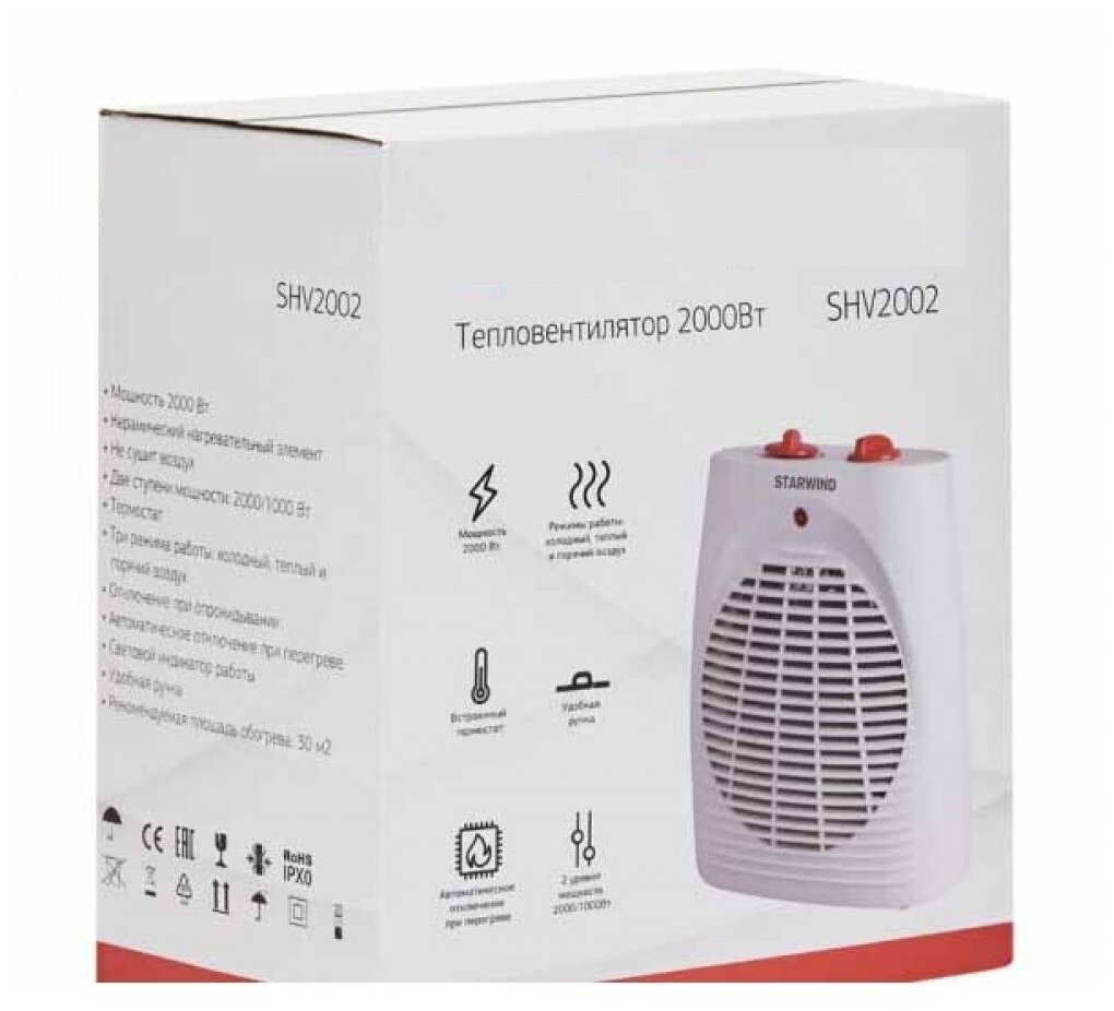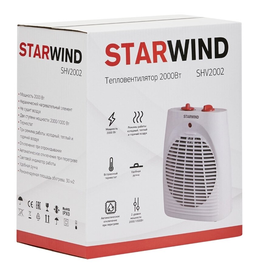 | Прочие особенности и свойства | Компактный и функциональный тепловентилятор STARWIND SHV2002 создаст комфортную температуру для отдыха или работы в любом месте в холодное время года. Тепловентилятор подходит для эксплуатации в помещениях складского, офисного и жилого типа. Работает от стандартной розетки на 220 В. Для изготовления использованы высококачественные материалы, которые гарантируют долгий срок службы и хорошую теплопроводность.,,Конструкция тепловентилятора STARWIND тщательно продумана:,,В нижней части корпуса предусмотрены ножки из противоскользящего материала для устойчивости и защиты поверхности от царапин;,,Панель управления с реле для регулирования мощности размещены в верхней части корпуса прибора. Механическим тип управления считается безопасным, с длительным сроком службы и простым в эксплуатации;,,За счет компактных размеров и небольшому весу прибор отличается портативностью и мобильностью, и не займет много места в комнате;,,Встроенный световой индикатор информирует пользователя о режиме работы в приборе.,,Тепловентилятор STARWIND SHV2002 оснащен мощным нагревательным элементом на 2000 Вт. Этого достаточно для быстрого и эффективного обогрева помещения площадью до 20 кв.м. Безопасность эксплуатации обеспечивает установленный термостат, защищающий прибор от перегрева и возможной дальнейшей поломки. При увеличении заданной температуры, специальное реле отключит работу нагревательного элемента.,,Тепловентилятор STARWIND сделан в лаконичном дизайне и стильном белом цвете. |