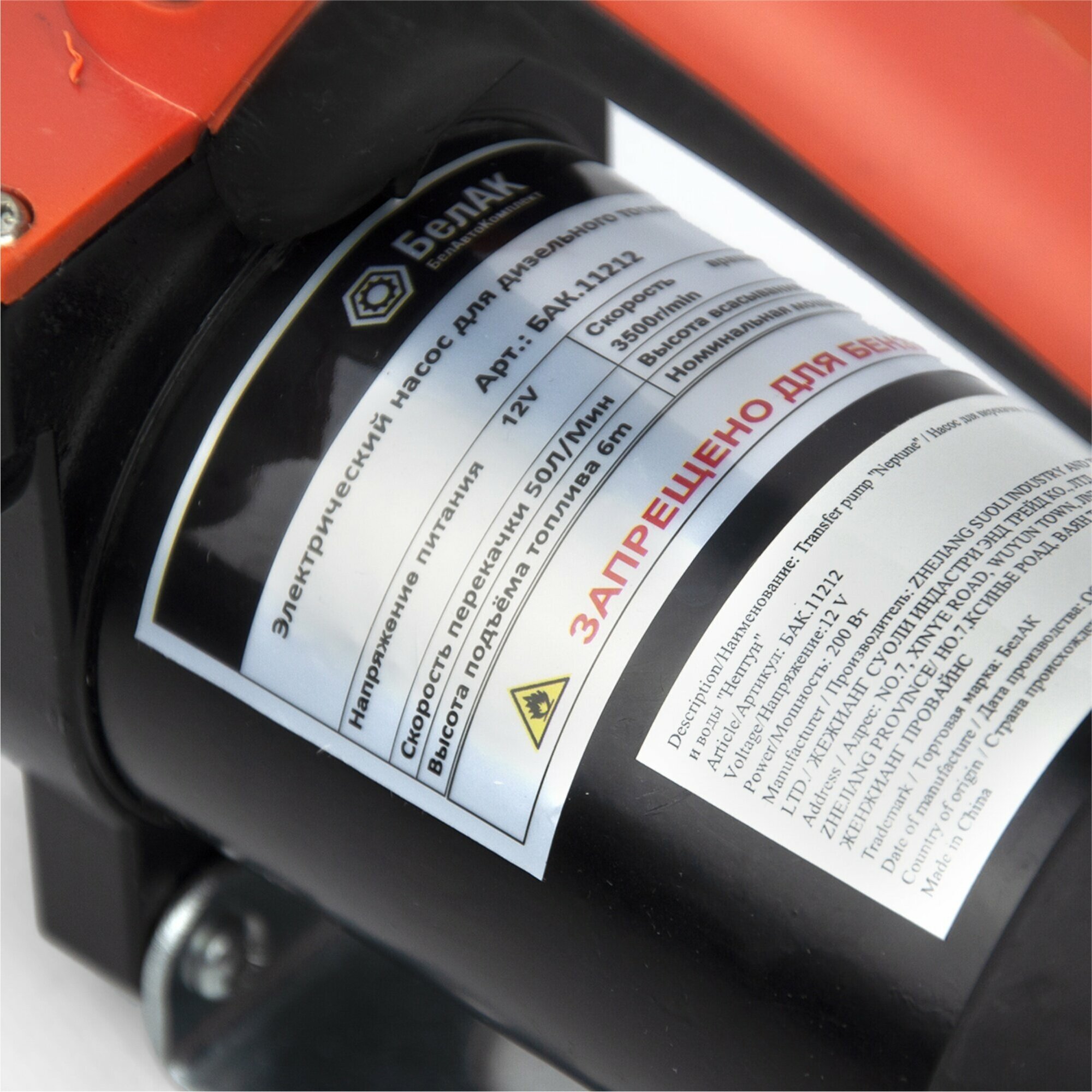 Насос для перекачки топлива и воды БелАК НЕПТУН , 12V, 50 л/мин - предназначен для перекачивания жидкостей в авторемонтных мастерских, станциях техобслуживания, а также для применения в быту. Компактные размеры и универсальные эксплуатационные характеристики обеспечивают удобное применение насосного оборудования в полевых условиях.Преимущества Применяется для удобного и быстрого перекачивания керосина, дизтоплива или воды из всевозможных баков, резервуаров и специальных емкостей Насос для перекачки топлива и воды 50 л/мин "Нептун" размещается в стороне от перекачиваемых жидкостей Непогружное исполнение перекачивающего оборудования обеспечивает его безопасную эксплуатацию Применение дополнительных фильтров грубой очистки исключает риск загрязнения рабочего узла, обеспечивая стабильную работу устройства Компактный насос предназначен для дизельного топлива, для воды, запрещается использовать для перекачивания бензина, горючих спиртов и растворителей