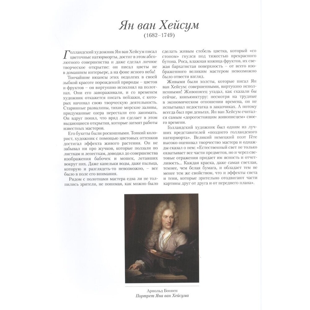 Голландский художник Ян ван Хейсум писал цветочные натюрморты. Великий мастер колорита, художник с помощью цветовых оттенков достигал эффекта живого растения. Во всех работах ощущается тонкая наблюдательность мастера, который не упускал ни одной мелочи, чтобы выразить свой восторг перед прекрасными порождениями природы. Он был невероятно востребованным мастером, прославив искусство Голландии своим виртуозным искусством.