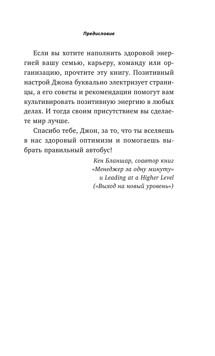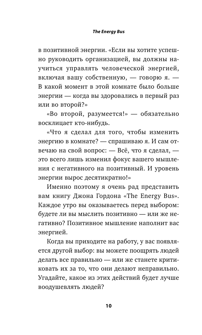 Невероятная книга, наполненная оптимизмом и вдохновением. Чем-то напоминает знаменитую книгу Робина Шармы. Здесь мы тоже видим некие уроки, преподнесённые в художественной форме. Перед нами Джордж, который терпит неудачи по всем фронтам. Всё потому, что своим негативным мышлением он лишает себя энергии. Но Energy Bus научит его, а за одно и всех нас, как избавиться от негатива и сделать жизнь лучше. Читайте, прокачивайте позитивное мышление и очищайте окружение от энергетических вампиров! Книга прекрасная!