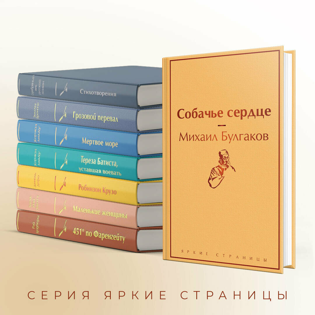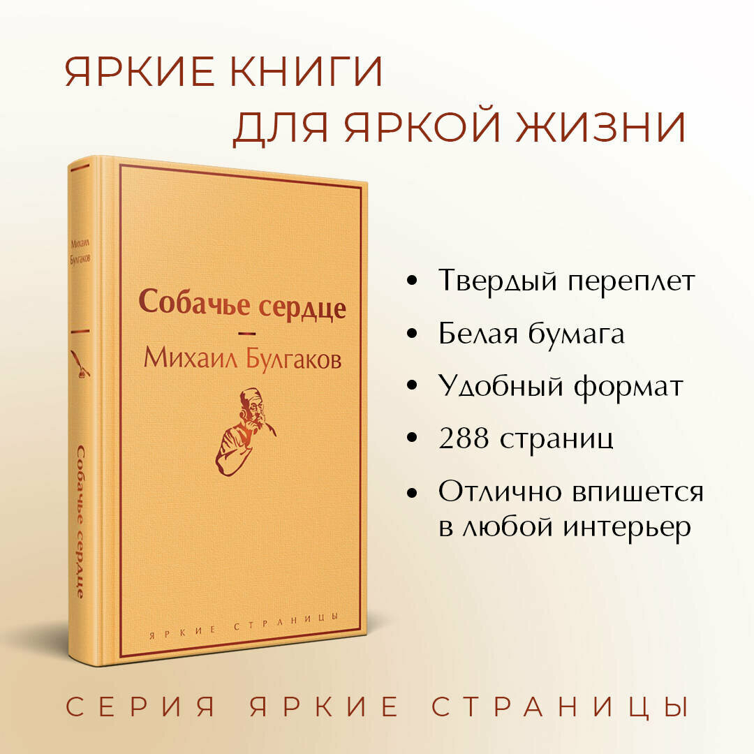 Собачье сердце - то, что обязательно надо прочитать у Булгакова. Очень много хороших цитат и идей. Сюжет интересный и увлекательный. Издание довольно приятное. Страницы очень яркие, белые. Шрифт тоже комфортный для чтения. С засечками, в отличие от того же "Мастера и Маргариты" этой серии. Приобрела книгу недавно, сложно сказать, что будет с буквами на обложке. Надеюсь, что блестящее напыление не посыпется.