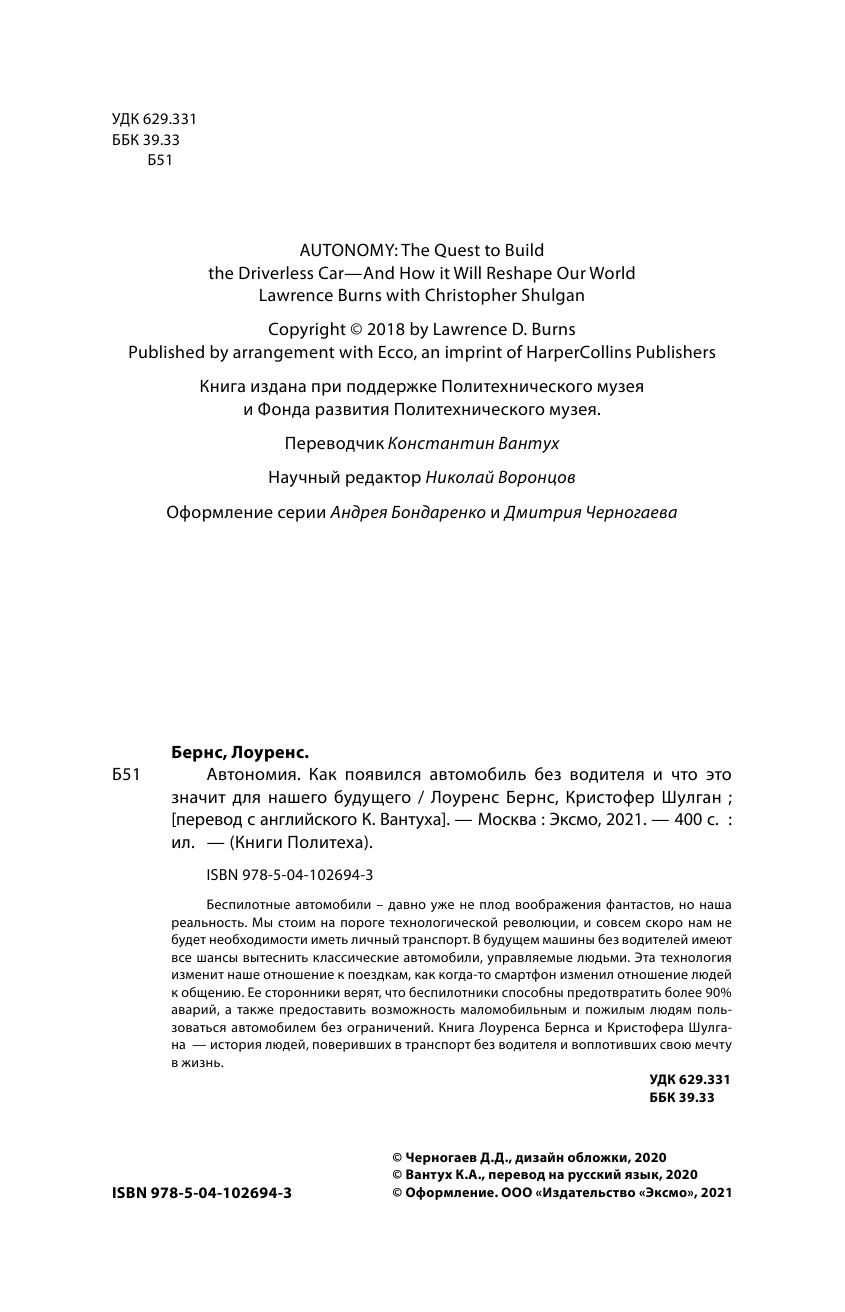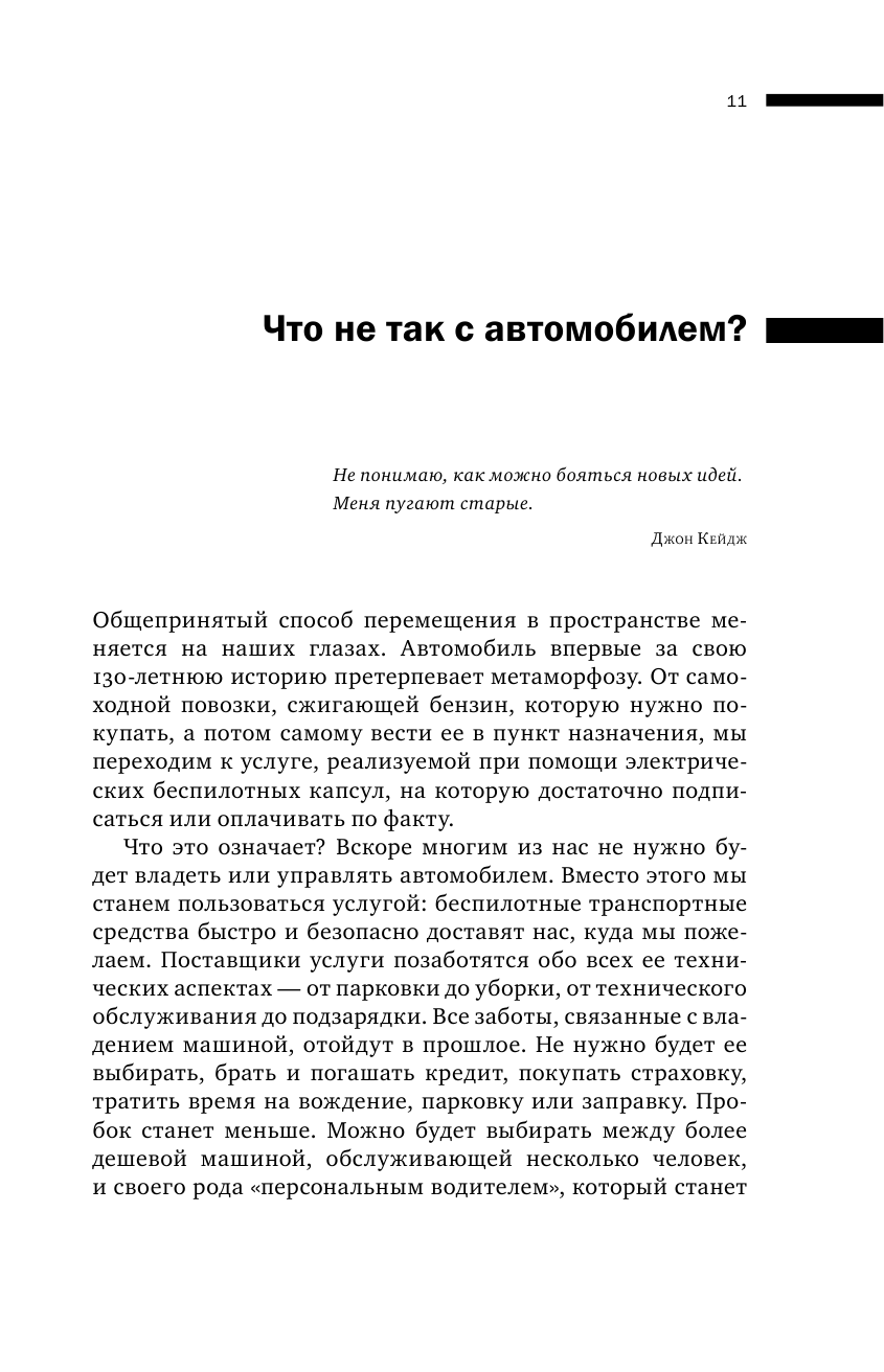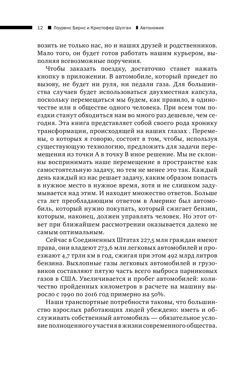 Беспилотные автомобили – давно уже не плод воображения фантастов, но наша реальность. Мы стоим на пороге технологической революции, и совсем скоро нам не будет необходимости иметь личный транспорт. В будущем машины без водителей имеют все шансы вытеснить классические автомобили, управляемые людьми. Эта технология изменит наше отношение к поездкам, как когда-то смартфон изменил отношение людей к общению. Ее сторонники верят, что беспилотники способны предотвратить более 90% аварий, а также предоставить возможность маломобильным и пожилым людям пользоваться автомобилем без ограничений. Книга Лоуренса Бернса и Кристофера Шулгана – история людей, поверивших в транспорт без водителя и воплотивших свою мечту в жизнь.