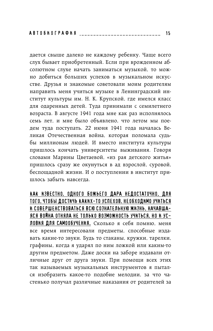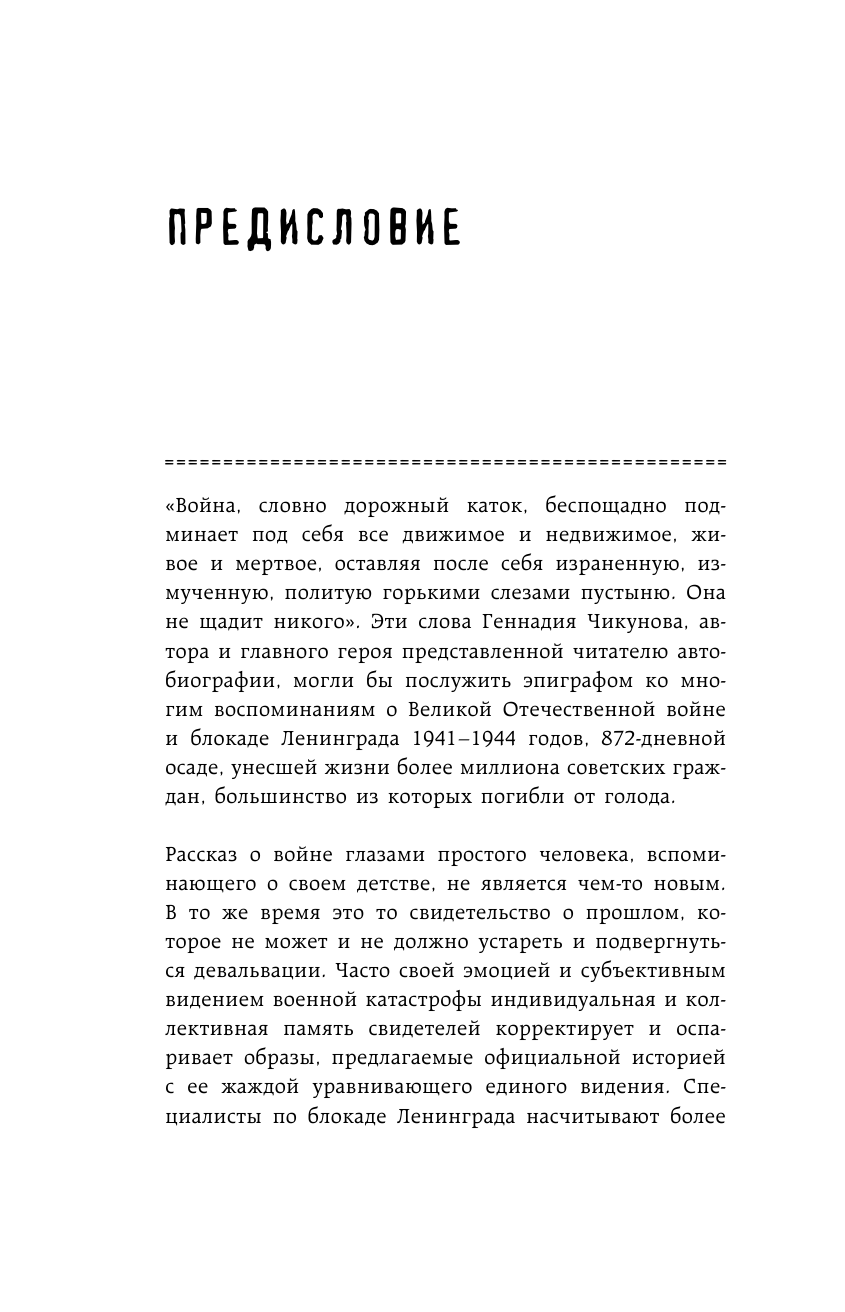 Автобиография Геннадия Чикунова — это воспоминания о том, как счастливое довоенное детство сменяется выживанием в блокадном Ленинграде, а наивная вера в лозунги сталинских парадов и агитфильмов испаряется перед лицом подлинного страдания.