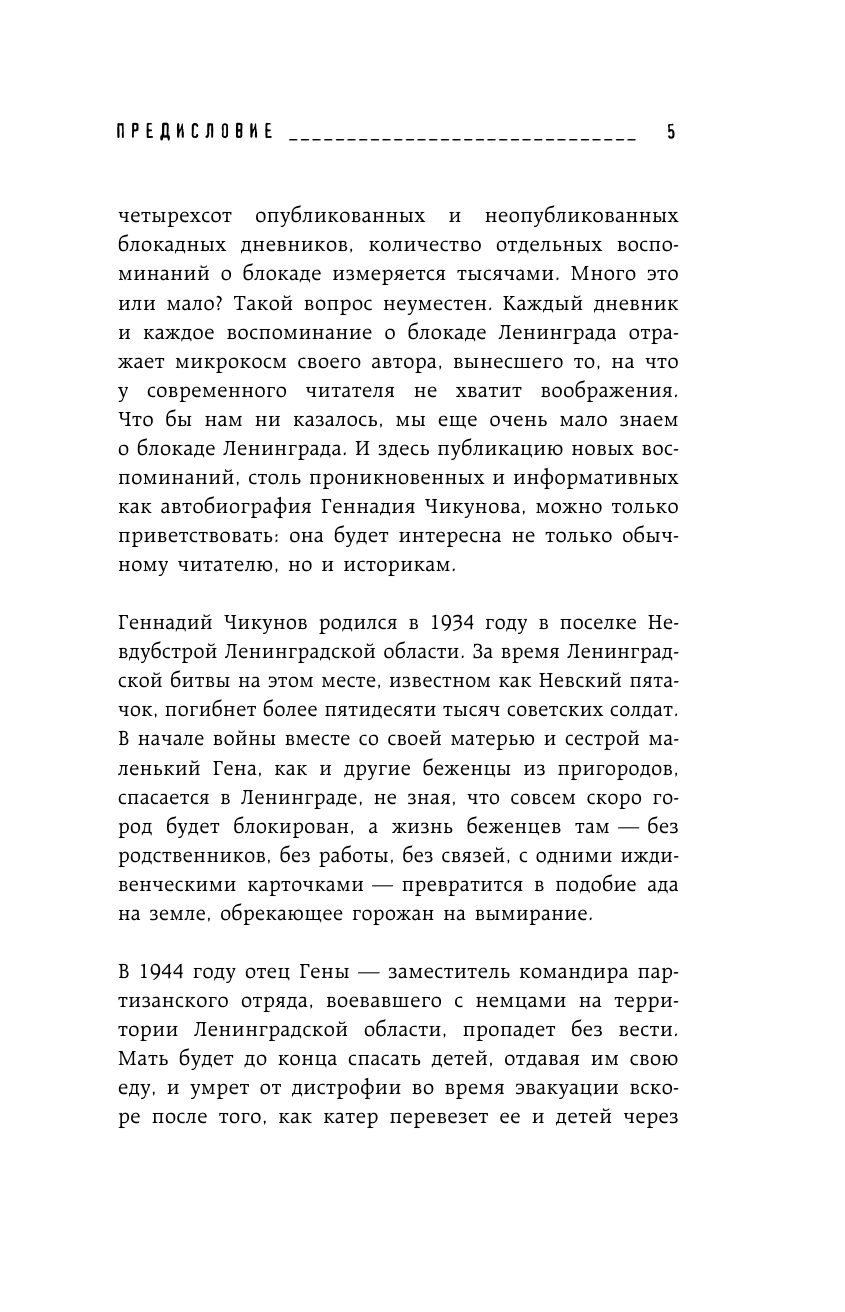 В отличие от многих похожих книг, концентрирующихся на блокаде как событии, "запаянном" с двух сторон мощными образами начала сражений и Победы, автобиография Чикунова создает особый мир довоенного, военного и послевоенного прошлого. Этот мир, показанный через оптику советского ребенка, расскажет современному читателю о том, как воспринимались конец 1930-х годов, Великая Отечественная война, "смертное время" блокады, чего стоила не менее опасная эвакуация и тяжелая жизнь на другом краю Советского Союза.