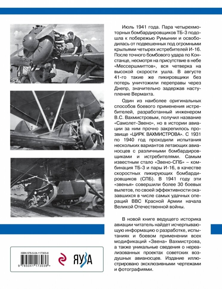 В новой книге ведущего историка авиации читатель найдет исчерпывающую информацию о разработке, испытаниях и боевом применении всех модификаций "Звена" Вахмистрова, а также уникальные сведения о нереализованных проектах советских воздушных авианосцев. Издание иллюстрировано эксклюзивными чертежами и фотографиями.