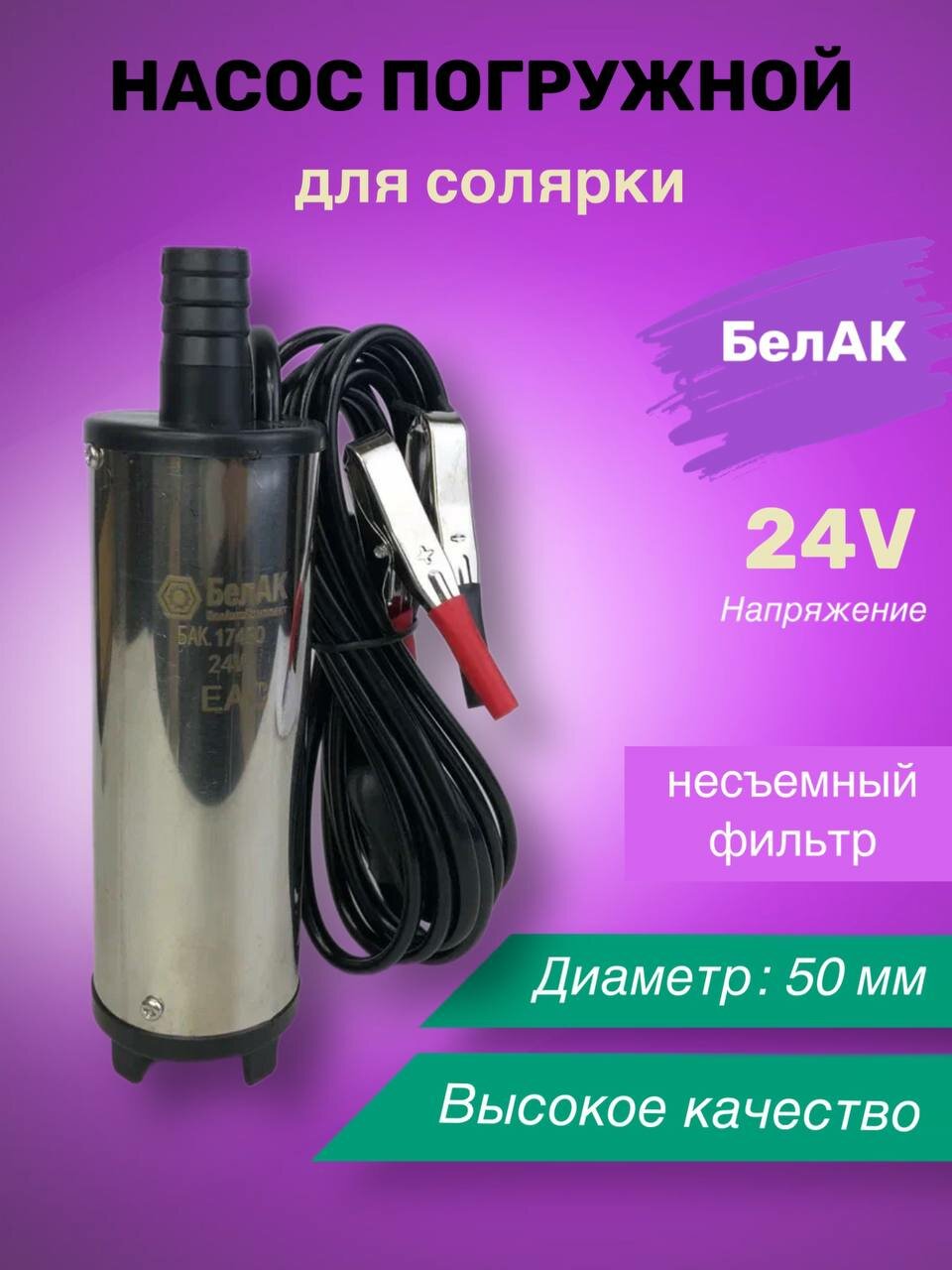 Тип насоса: погружной центробежныйТип перекачиваемой жидкости: дизельное топливо, керосинПроизводительность: 32 л/минНапряжение: 24 VТок: 7АДиаметр насоса: 50 мм. Диаметр патрубка:18 мм. Высота подачи топлива: 2 м. Код для заказа (артикул): БАК.17450 Насос для перекачки топлива 50 мм. 24V, описание продукта:Насос электрический погружной БАК.17450 диаметром 50 мм. предназначен для подключения к источнику питания постоянного тока номинальным напряжением 24 Вольта. Насос оборудован несъёмным фильтром грубой очистки топлива, ножками в нижней части для предотвращения присасывания устройства к дну ёмкости с топливом, зажимами "крокодильчиками" для подключения к источнику питания и выключателем на электрическом шнуре.