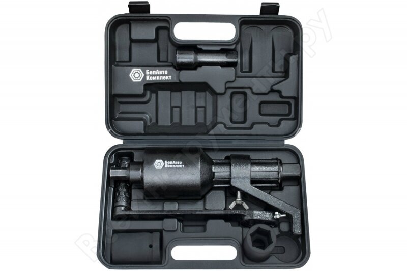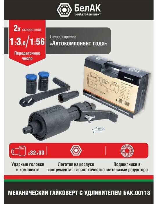 Гайковерт механический ручной 2х-скоростной с удлинителем и набором головок (32 мм, 33 мм), "БелАК" разработан российским производителем «БелАК», награждённым девятью национальными премиями «Автокомпонент года» и «Автоаксессуар года». Отдельная премия «Автокомпонент года» присуждена в номинации «Механические гайковерты» за высокое качество и надежность выпускаемых гайковертов. Продукция «БелАК» соответствуют нормам сертификации ISO9001 и ЕАС.Гайковерт выполнен из высокопрочных материалов, отличается повышенной надежностью и продолжительным сроком службы. Усиление крутящего момента осуществляется за счет планетарного трёхступенчатого редуктора. Данный инструмент служит для закручивания/откручивания тяжело нагруженных болтов и гаек при проведении шиномонтажных работ на грузовых автомобилях. Фирменный логотип на корпусе, выполненный на этапе отливки, защищает от подделок и является гарантом оригинальности изделия. Индивидуальная упаковка головок (индивидуальный пакет + крышка с логотипом) защищает их от коррозии. Передаточное число: 1:56, то есть приложенное усилие будет увеличено в 56 раз.Наличие удлинителя позволяет легко производить монтажные работы с внутренними колесами задней оси многоосных грузовиков.Эта модель гайковерта с двумя скоростными режимами обеспечивает эффективное усиление крутящего момента (до 56 раз) для удобного откручивания прочных соединений при минимальной нагрузке на руки. Переключатель скорости вращения применяется для изменения значения передаточного числа усилителя крутящего момента. Смена режимов работы осуществляется посредством вытягивания наружу или вдавливания внутрь переключателя. В положении «низкая скорость» развивается максимальное значение крутящего момента, значение передаточного числа составляет 1:56. Применяется для срыва и окончательной затяжки колесных гаек. В положении «максимальная скорость» передаточное число составляет 1:4. Применяется для предварительного закручивания гаек пред окончательной затяжкой или для быстрого откручивания.В механизме редуктора гайковерта использованы подшипники, а не втулки скольжения, как у аналогов. Все головки для гайковертов «БелАК» являются ударными.В комплект входит надежный морозостойкий и ударопрочный кейс, который обеспечит удобное и безопасное хранение инструмента.