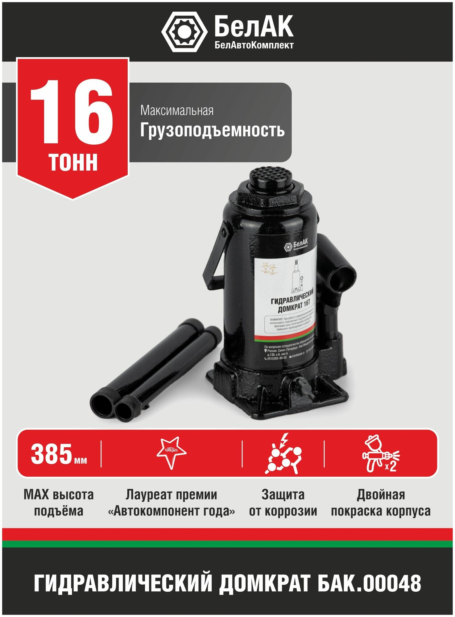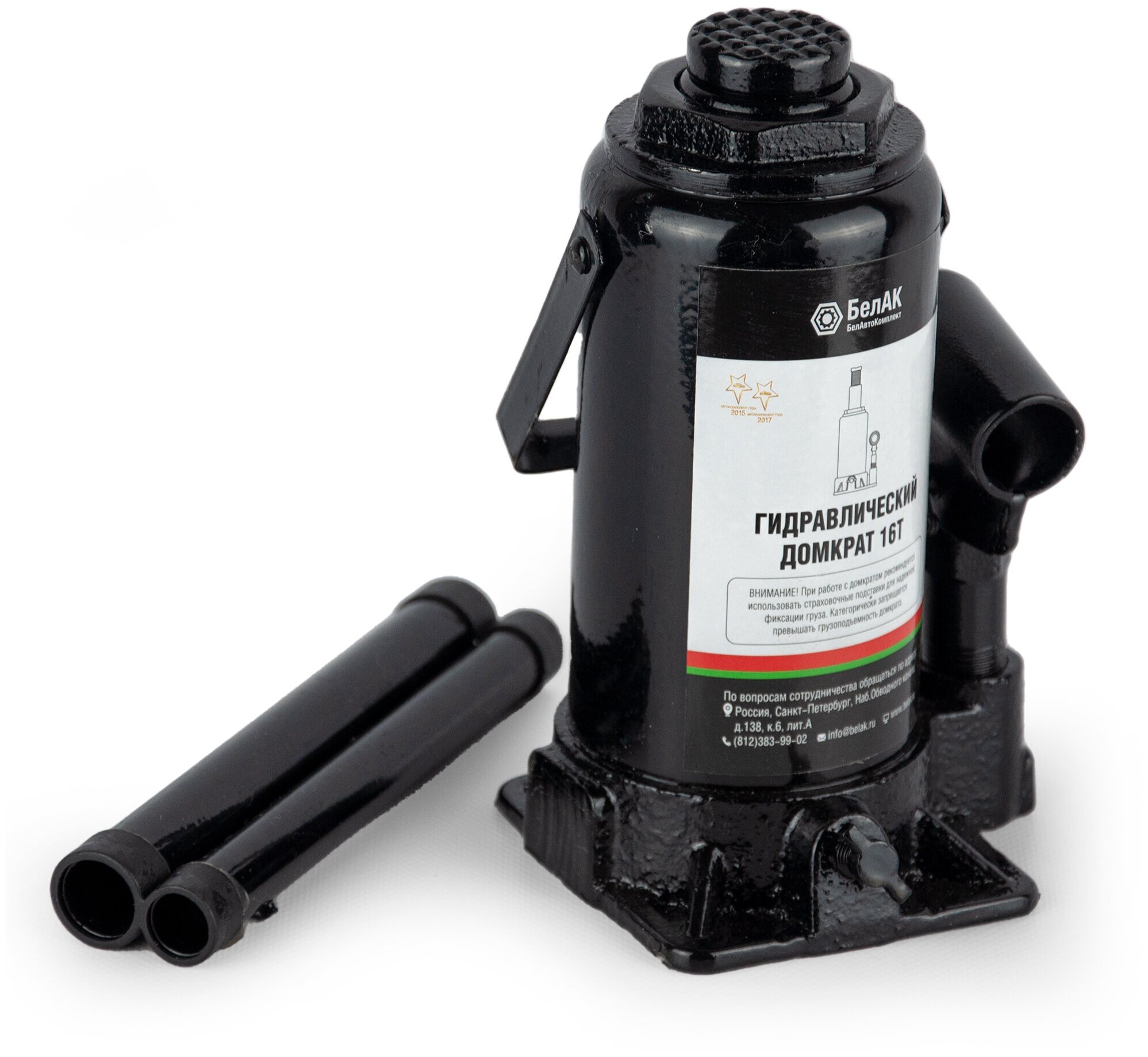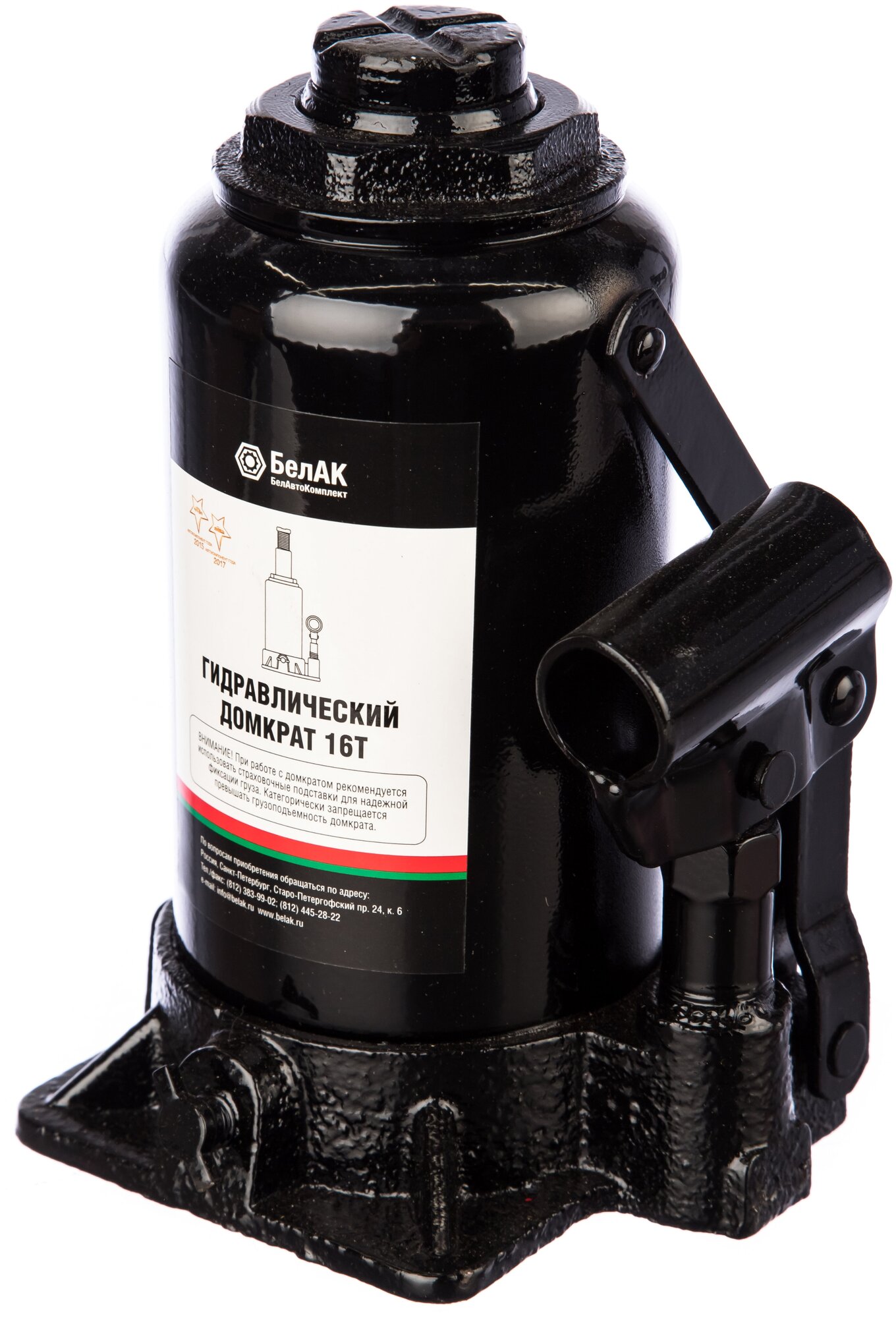 Домкрат гидравлический бутылочный 16 тонн "БелАК" разработан российским производителем «БелАК», награждённым двумя национальными премиями «Автокомпонент года» и «Автоаксессуар года» за высокое качество и надежность выпускаемых домкратов. Продукция «БелАК» соответствуют нормам сертификации ISO9001 и ЕАС.
