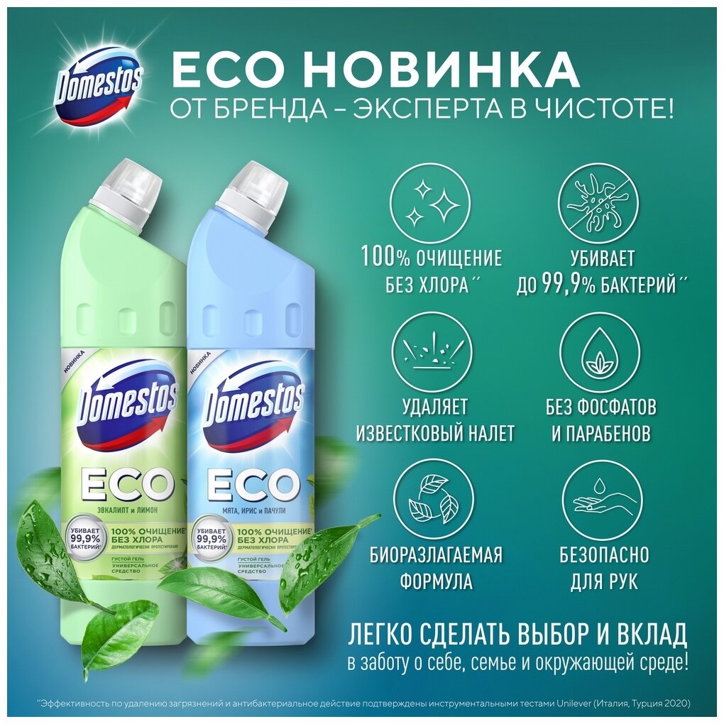 Новый Domestos ECO Мята, Ирис и Пачули, 750 мл. уникальная* комбинация эффективности и натуральности. Универсальный чистящий гель Domestos ECO подходит для любых поверхностей в доме! Формула на основе лимонной кислоты отлично справляется со сложными загрязнениями, уникальный* антимикробный компонент убивает до 99,9% бактерий без активного хлора. Domestos ECO гель эффективно растворяет налет в ванной и унитазе, удаляет ржавые и желтые пятна, выводит въевшиеся пятна грязи, а также убивает микробы и поддерживает чистоту, оставляя приятный запах надолго.