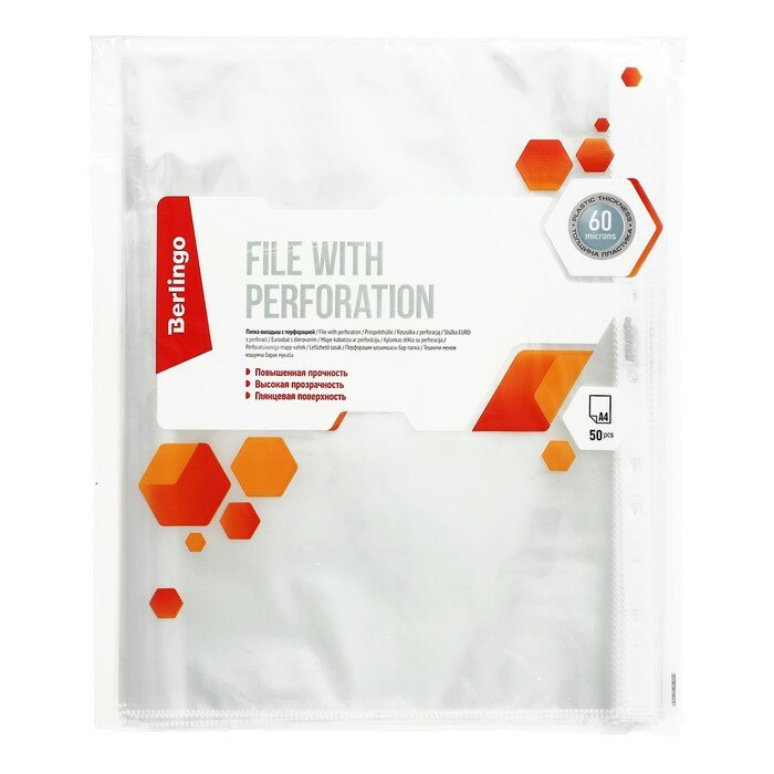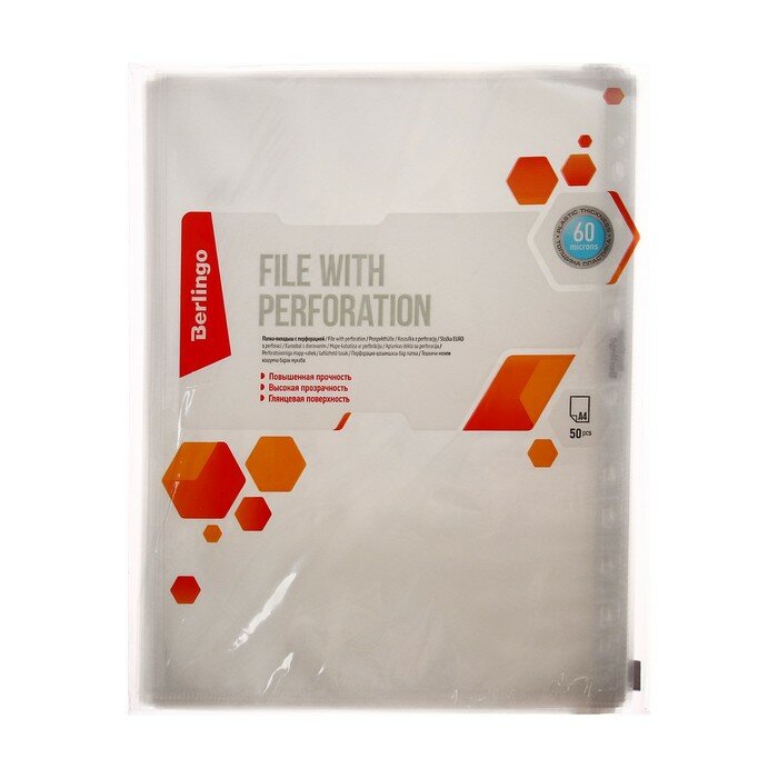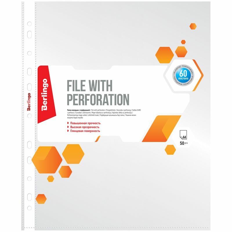 Файл-вкладыш А4 Berlingo: организация и защита ваших документовФайл-вкладыш А4 Berlingo представляет собой практичный и стильный аксессуар для хранения и защиты ваших документов. Изготовленный из качественного пластика толщиной 60 мкм, этот продукт обеспечивает надежную защиту ваших документов от повреждений и загрязнений.Формат А4 и вместительностьФайл-вкладыш А4 Berlingo имеет удобный формат А4, который позволяет разместить в нем большое количество документов. В каждой групповой упаковке содержится 50 штук, что обеспечивает долгосрочное использование и экономию средств.Перфорация и глянцевый дизайнФайл-вкладыш имеет перфорацию, что позволяет легко отделить нужный документ от остальных. Глянцевый дизайн придает продукту современный и стильный вид, который будет гармонично смотреться в любом офисе или домашнем кабинете.Разнообразие цветов и материаловФайл-вкладыш представлен в трех различных цветах: белом, бежевом и прозрачном. Это позволяет выбрать наиболее подходящий вариант для вашего рабочего пространства или стиля.Выбирая файл-вкладыш А4 Berlingo, вы получаете практичный и стильный аксессуар для хранения и защиты ваших документов. Благодаря разнообразию цветов и материалов, а также вместительности и перфорации, этот продукт станет незаменимым помощником в вашем офисе или домашнем кабинете.
