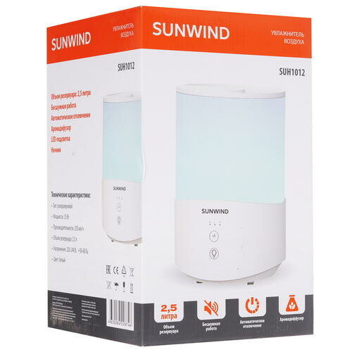 | Особенности | SunWind SUH1012 – компактный ультразвуковой увлажнитель воздуха с сенсорным управлением, ночным светильником с 7 цветовыми вариантами подсветки и ароматизацией. Благодаря верхнему заливу воды больше не нужно носить резервуар для наполнения водой в ванную. |