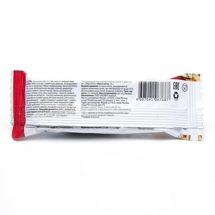 Описание товара:Батончик-мюсли с яблоком и семенем льна – сочетание отличного вкуса и пользы ингредиентов.Состав товара:Злаки (хлопья: пшеничные, овсяные; экструдированные рис и кукуруза), патока, глазурь (сахар, масло растительное, сухое обезжиренное молоко, лактоза, эмульгатор - лецитин соевый, ароматизатор), масло растительное, яблоки, семена льна, мед, эмульгатор - лецитин соевый, регулятор кислотности - кислота лимонная, ароматизатор, консерванты (сорбат калия, бензоат натрия), агент влагоудерживающий - сорбит.Меры предосторожности:Индивидуальная непереносимость компонентов.