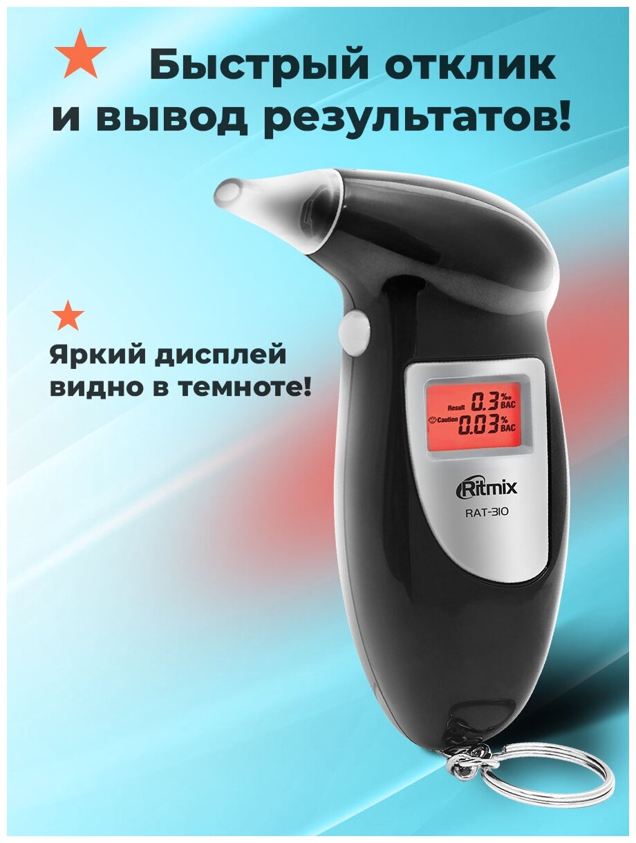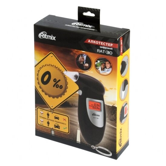 Алкотестер Ritmix предназначен для проведения персонального измерения концентрации алкоголя в парах выдыхаемого воздуха. Прибор пересчитывает полученные данные на концентрацию алкоголя в крови и выдает результат на цифровой дисплей.