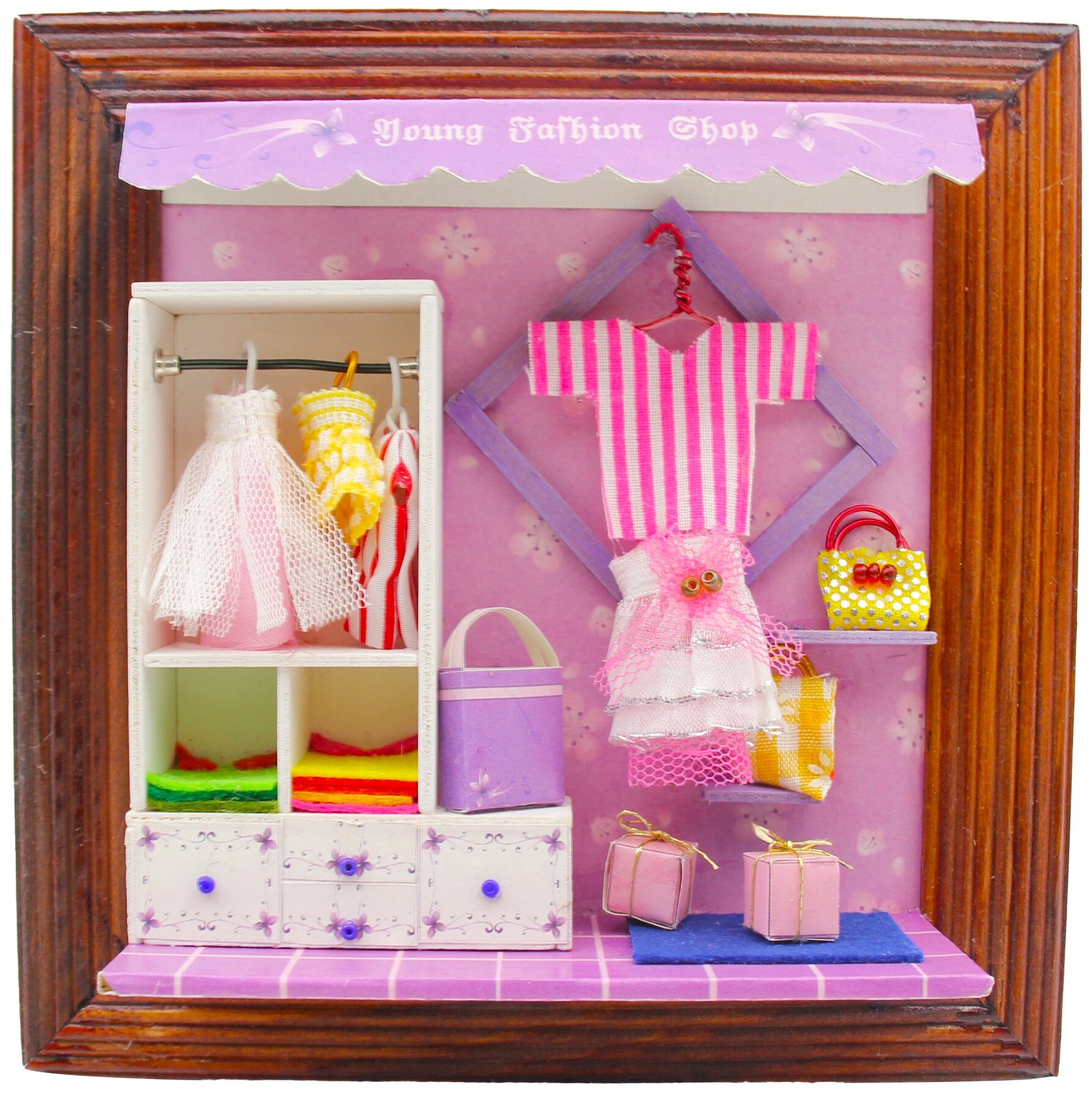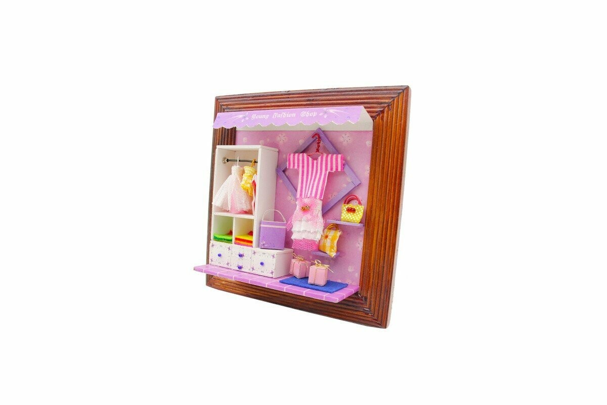 Это стильное панно, изображающее гардероб юной модницы, которое как и румбокс, необходимо сначала собрать из мельчайших деталей. Рамка станет прекрасным украшением в детской комнате или прекрасным подарком для маленькой принцессы. Натуральные материалы для сборки - дерево, бумага, ткани.