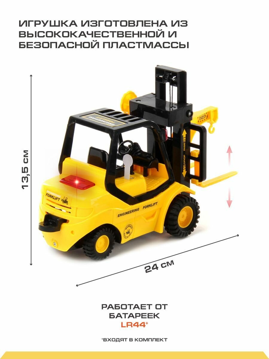 Погрузчик работает от 3 батареек LR44, входят в комплект.