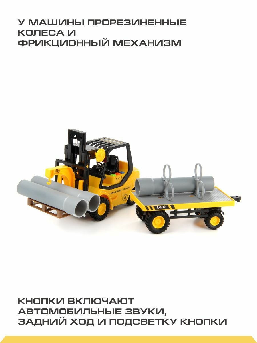 Высокая детализация проработки, реалистичный дизайн и яркая расцветка сделают эту игрушку любимицей ребенка. С ней юный поклонник спецтехники обязательно придумает огромное количество веселых забав, ведь у игрушки много подвижных элементов и функций. В комплект входят вилочный погрузчик с поддоном, прицеп и трубы.