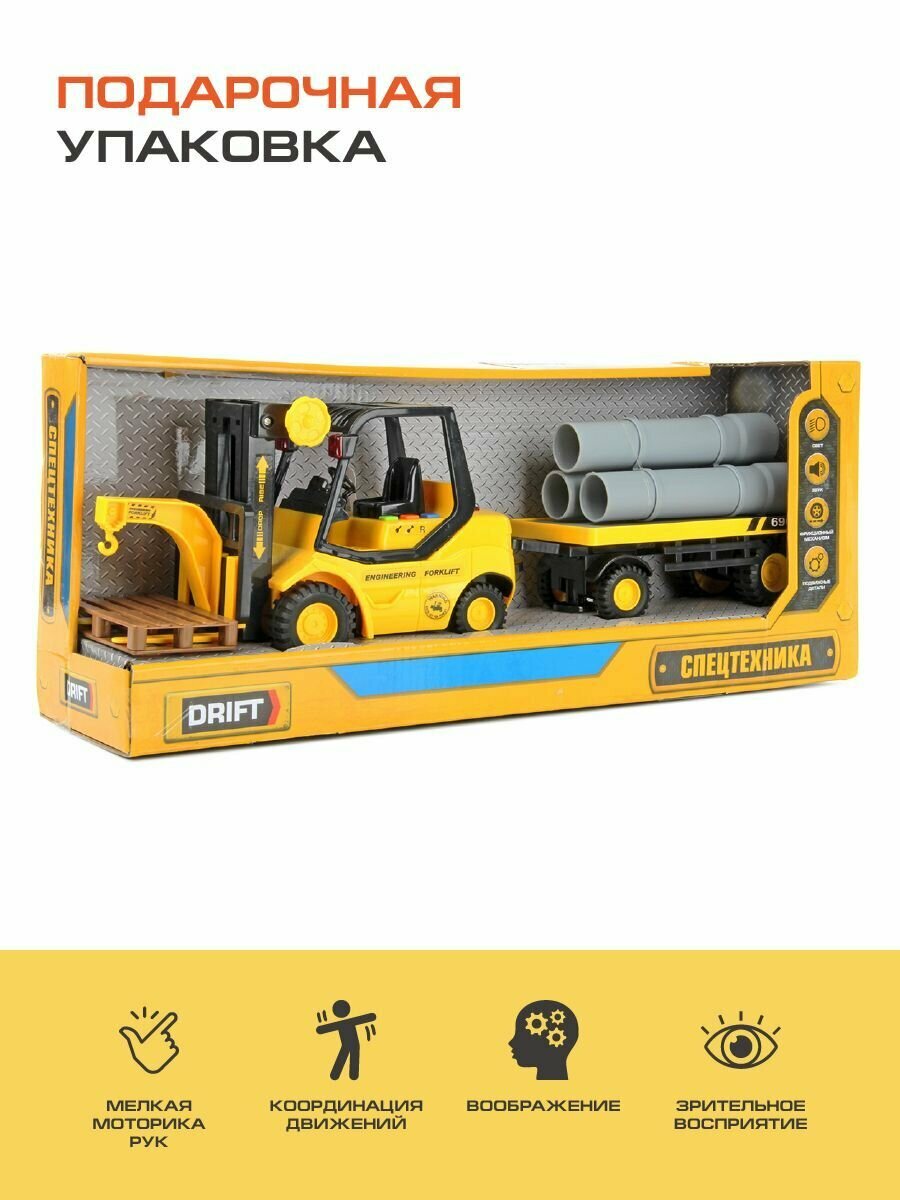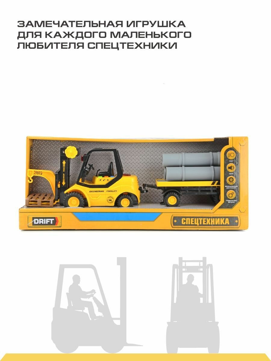 Погрузчик вилочный с прицепом и трубами Drift 1:16 свет звук 102688 Погрузчик вилочный с прицепом и трубами 1:16
