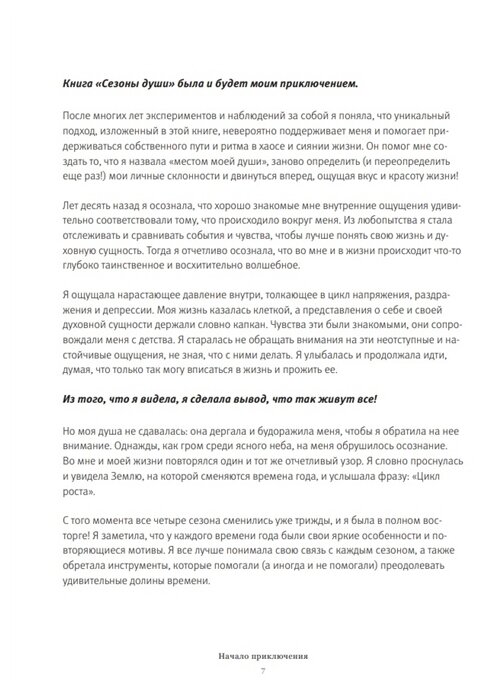 Очень необычная, интересная и красивая книга. Подарил ее своей девушке на День рождения, но тоже решил прочитать, потому что люблю подобную литературу и нахожу в ней нечто магическое для своей души. Эта книга проведет вас по всем четырём сезонам года и покажет то, как она связаны с вами и вашей жизнью. Каждый сезон несет в себе свой определенный смысл и свою цель. Книга разбита на сезоны года (всеми знакомые зима, весна, лето и осень), и по каждому из сезонов написаны рекомендации, практики и многое другое. Очень рекомендую!