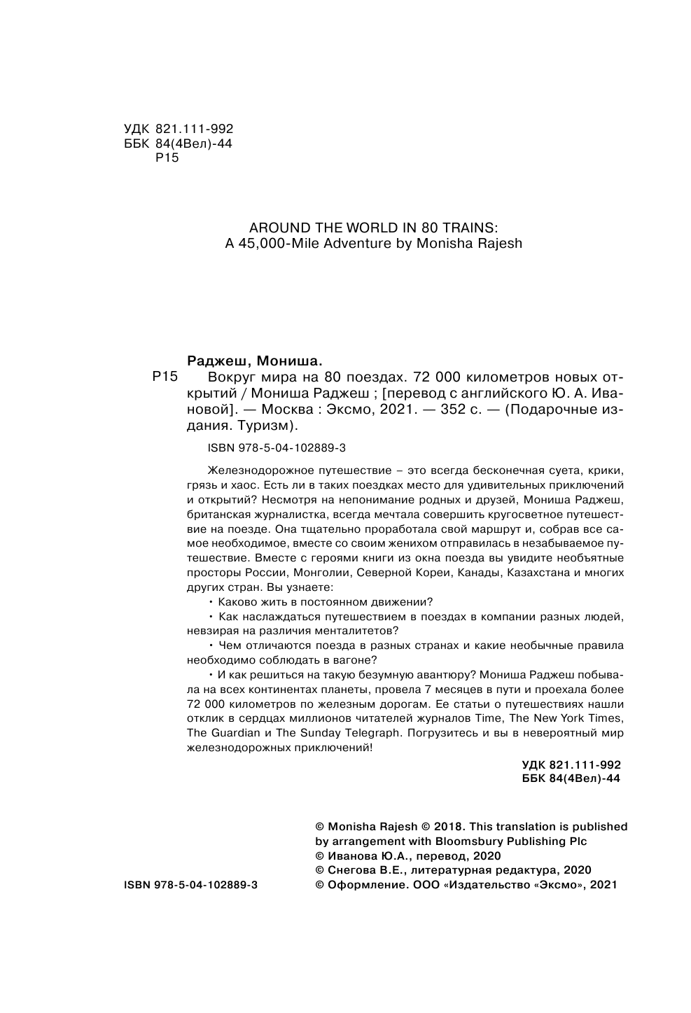 Железнодорожное путешествие – это всегда бесконечная суета, крики, грязь и хаос. Есть ли в таких поездках место для удивительных приключений и открытий? Несмотря на непонимание родных и друзей, Мониша Раджеш, британская журналистка, всегда мечтала совершить кругосветное путешествие на поезде. Она тщательно проработала свой маршрут и, собрав все самое необходимое, вместе со своим женихом отправилась в незабываемое путешествие. Вместе с героями книги из окна поезда вы увидите необъятные просторы России, Монголии, Северной Кореи, Канады, Казахстана и многих других стран. Вы узнаете: