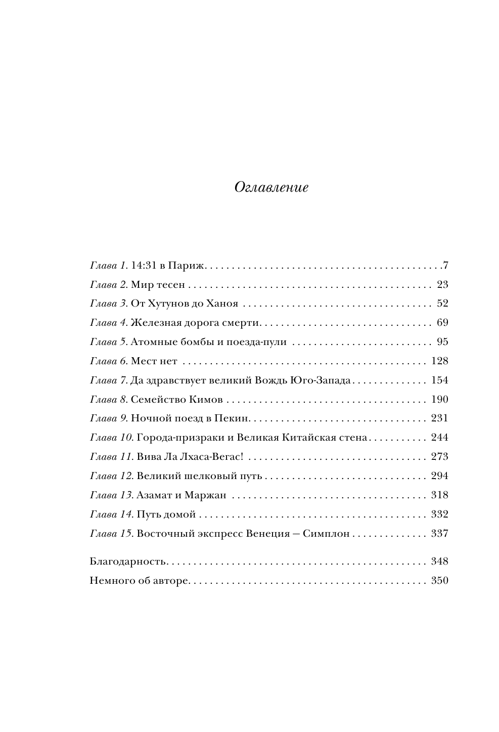 Осторожно, перед вами книга, при прочтении которой автоматически возникает желание сесть в поезд и поехать в новое путешествие! Жаль, пока нельзя, зато можно почитать книгу и представить стук колес. Очень понравилась часть про путешествие по Северной Корее. Хорошо, что есть такие люди, которые не боятся туда ехать и рассказывают потом всю правду. Замечательная книга в своем жанре.