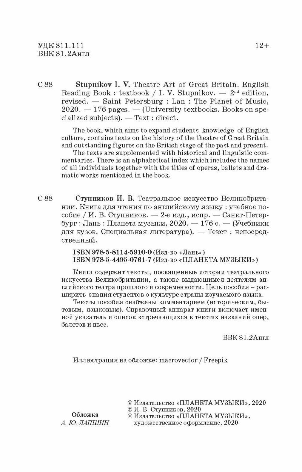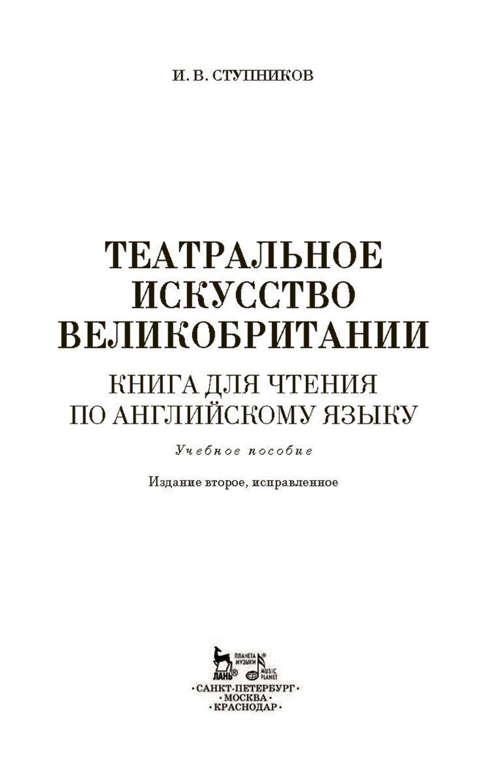 Театральное искусство Великобритании. Книга для чтения по английскому языку. Учебное пособие (И. В. Ступников); Издательство «Планета музыки», 2020