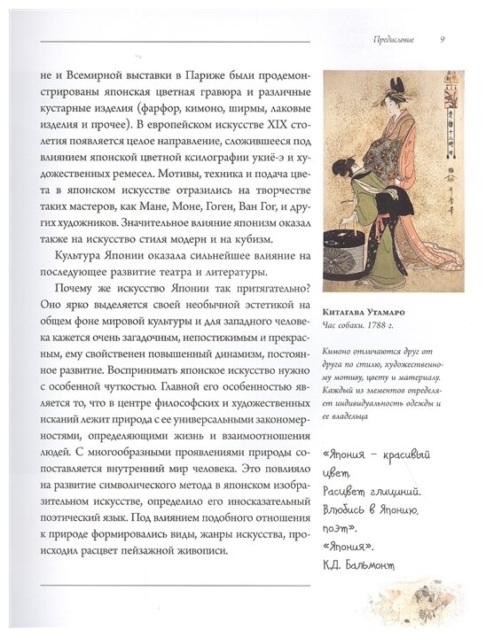 Из плюсов: красочные иллюстрации, неплохо для первичного ознакомления с искусством Японии. Из минусов: плохая верстка (предложение, и даже слово, может продолжиться через пару страниц; в одном месте слово оборвалось посередине, но дальше продолжения не было, а начался совсем другой абзац; текст расположен слишком близко к центру книги); плохая подача информации, текст будто надерган из разных статей и не всегда абзацы согласуются друг с другом, например, "10 мая ... было последним днем жизни Хокусая, который на тот момент находился в возрасте ... 90 лет" и дальше идет абзац "Поскольку в поясняющем тексте на гравюре ...", сама гравюра при этом расположена на предыдущем развороте; много опечаток.