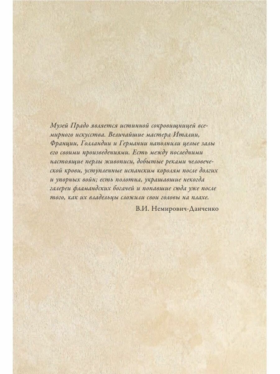 Книга, заслуживающая внимание во всех смыслах. Очень добротное, прекрасно иллюстрированное издание с великолепным рассказом о шедеврах музея Прадо. Качество полиграфии замечательное: картины можно рассматривать долго, любоваться творениями известных веэсему миру художников. При этом информация представлена полно и в то же время компактно, много цитат известных искусствоведов, художников, людей искусства.