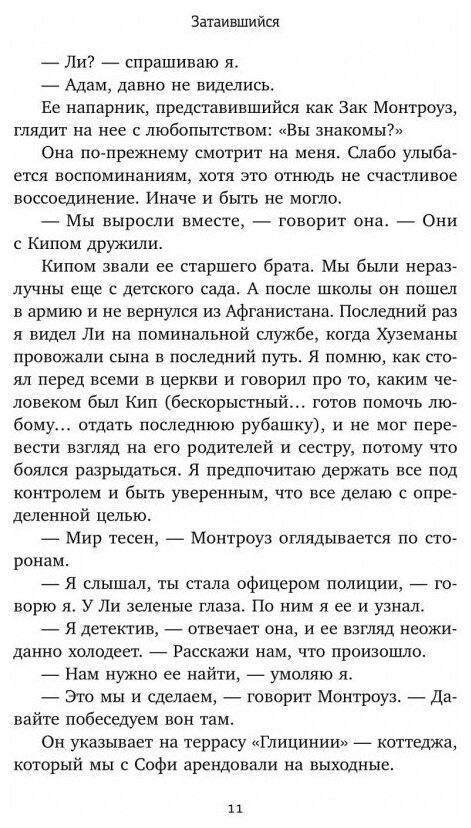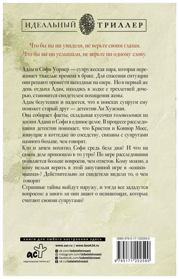 В расследовании ему помогает давняя подруга – детектив Ли Хуземан. Как мозаику она собирает подробности брака Софи и Адама и понимает, что многие детали отсутствуют или не совпадают. Поиски приводят Ли к соседям Уоренов – Кристен и Коннор Мосс, и детектив понимает, что те знают больше, чем говорят.