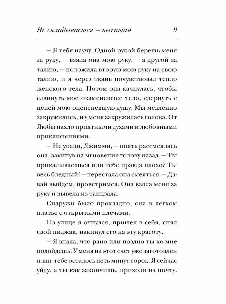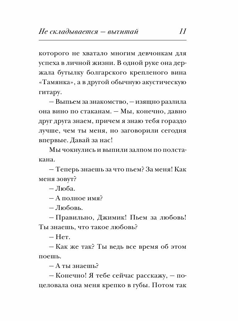 «Не складывается – вычитай» – книга о взаимоотношениях между мужчиной и женщиной. Двадцать три истории о чувствах: позитивных, неожиданных, дерзких – не всегда взаимных, порой оставшихся теплым воспоминанием из прошлого, о чувствах, которые могут зародиться даже после случайной встречи в лифте и не угаснуть после нескольких лет брака. Все истории взяты из жизни, ни одна из них не выдумана.