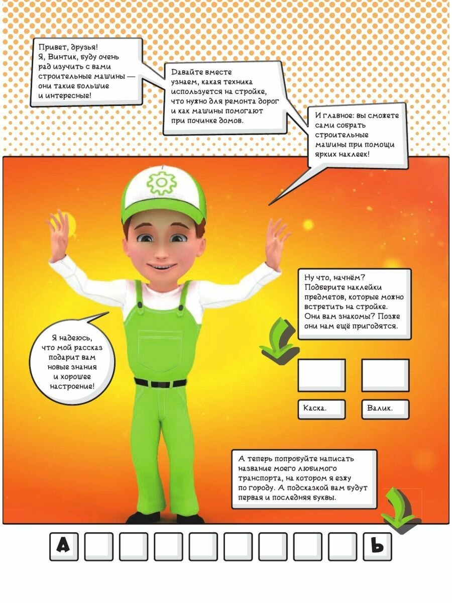 В книге «ВИНТИК ИЗУЧАЕТ СТРОИТЕЛЬНЫЕ МАШИНЫ» вместе с главным героем юные читатели познакомятся со строительными машинами, узнают, какую ещё технику используют на стройке и как ремонтируют дороги и дома. И главное: ребята смогут сами собрать строительные машины — 100 ярких наклеек внутри книги именно для этого! Надо лишь для каждой из них найти своё место.