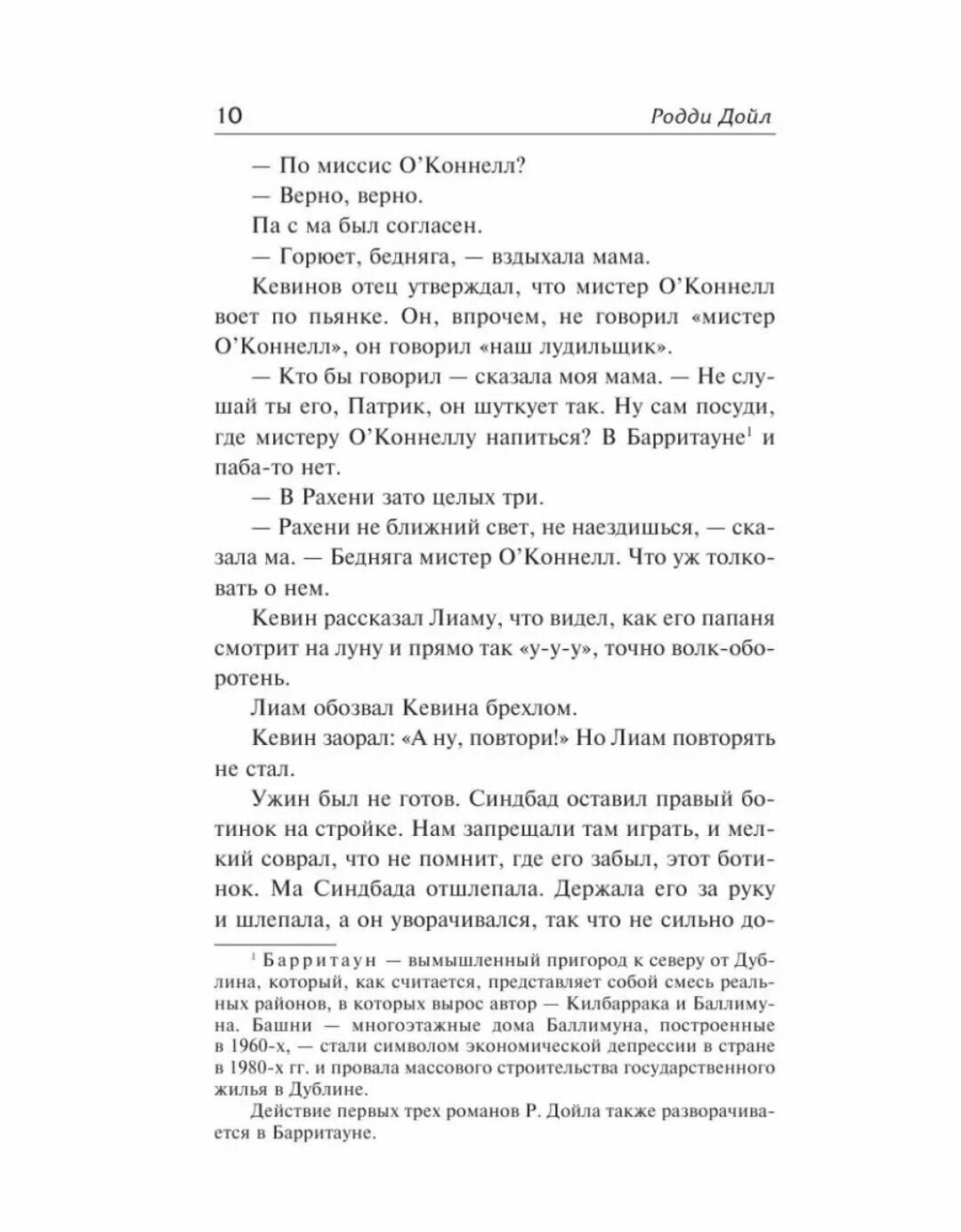 На дворе 1968 год. Патрику «Падди» Кларку десять, он живет в Барритауне – пригороде Дублина – с ма и па, братом Синдбадом и двумя сестренками. Падди ходит в школу, гоняет в футбол на улицах и играет с друзьями в ковбоев. Любит индейца Джеронимо, святого отца Дамиана и его прокаженных и футболиста Джорджа Беста. Ненавидит зоопарк, поцелуи и своего младшего брата. А еще Падди чувствует, что его мир вот-вот изменится навсегда…