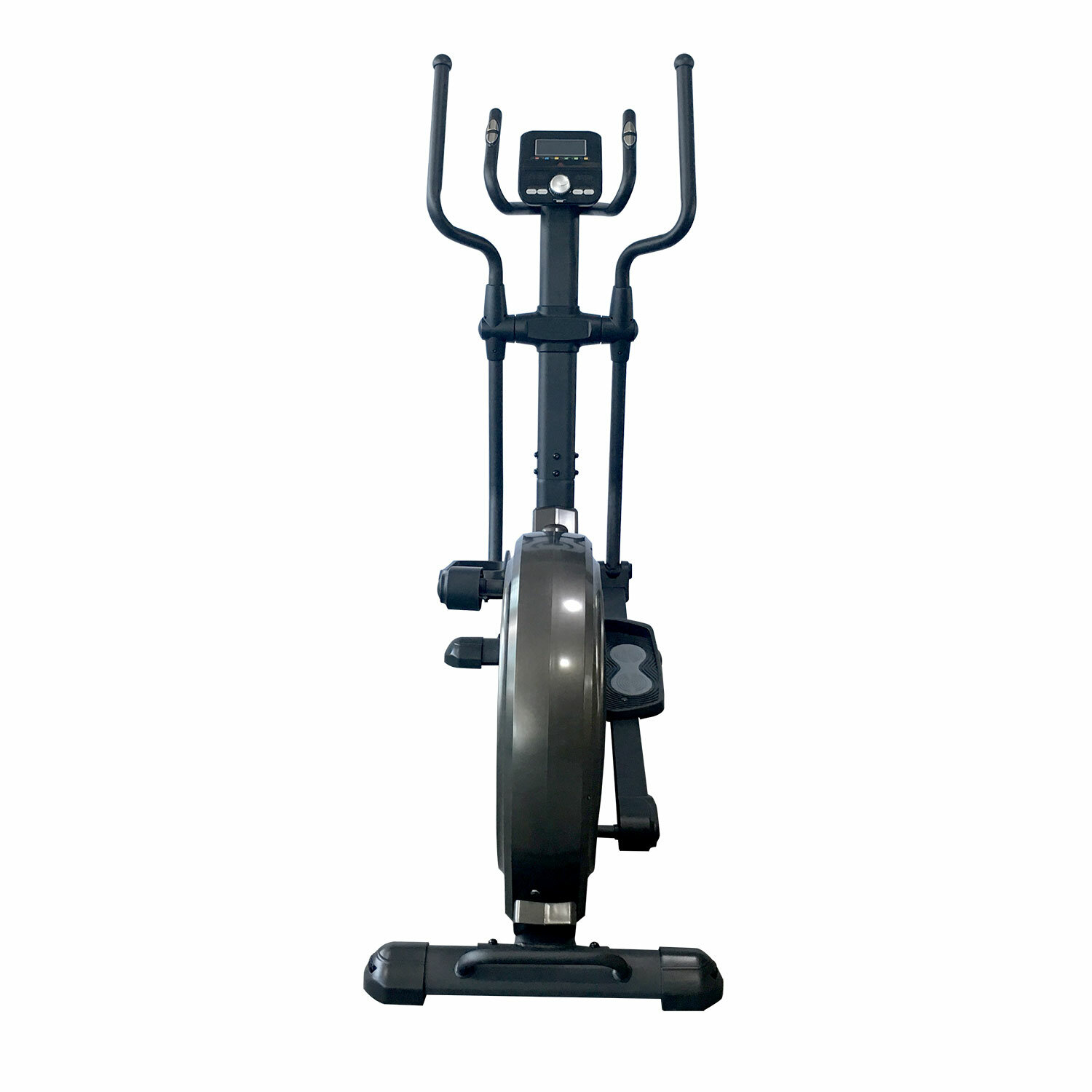 Эллиптический тренажер с задним расположением маховика для домашнего использования. Тренировка на эллиптическом тренажере - это прекрасная альтернатива бегу трусцой или ходьбе, с разницей в высоком сжигании калорий. Благодаря интенсивному движению рук верхние участки тела напрягаются, все тело укрепляется, повышается эффективность тренировки.Модель с удлиненной базой и бесшумной магнитной нагрузкой - система сопротивления с постоянным магнитом и тончайшей настройкой интенсивности. Электронная регулировка сопротивления с помощью компьютера.На тренажере установлен простой и современный компьютер с ЖК-дисплеем. Управление с помощью большой ручки „Push & Turn“. На дислее отображается весь необходимый список параметров тренировки. Измерение пульса осуществляется с помощью встроенных датчиков на дополнительных поручнях. Мощная рама тренажера, усиленная конструкция из стального профиля, позволит заниматься пользователю весом до 135 кг. Широкие педали с нескользящей вставкой. Транспортировочные колеса в передней части обеспечивают свободное перемещение тренажера по комнате. Задний стабилизатор с регулировкой положения на неровной поверхности.