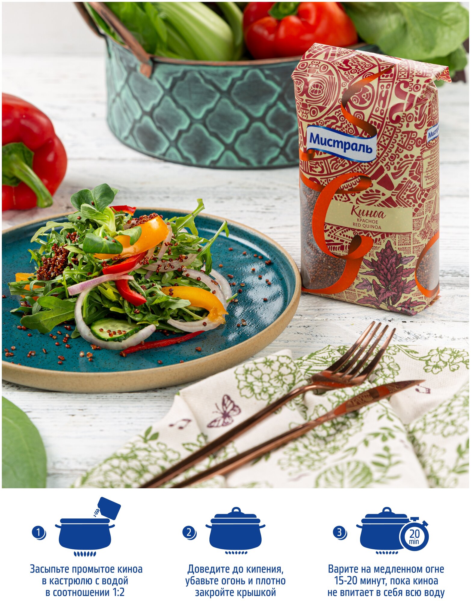 Киноа это хлебная зерновая культура семейства амарантовых, произрастающая на склонах Анд в Южной Америке. Красное киноа отличается тем, что содержит много антиоксидантов. Цвет этого злака может варьироваться от ярко-оранжевого, до темно-красного, а после приготовления становится коричневым. Чаще всего киноа используется в качестве гарнира: оно отлично сочетается с рыбой, птицей, мясом или овощами. Красное киноа отлично сохраняет форму в процессе приготовления и поэтому идеально подойдет для салатов.