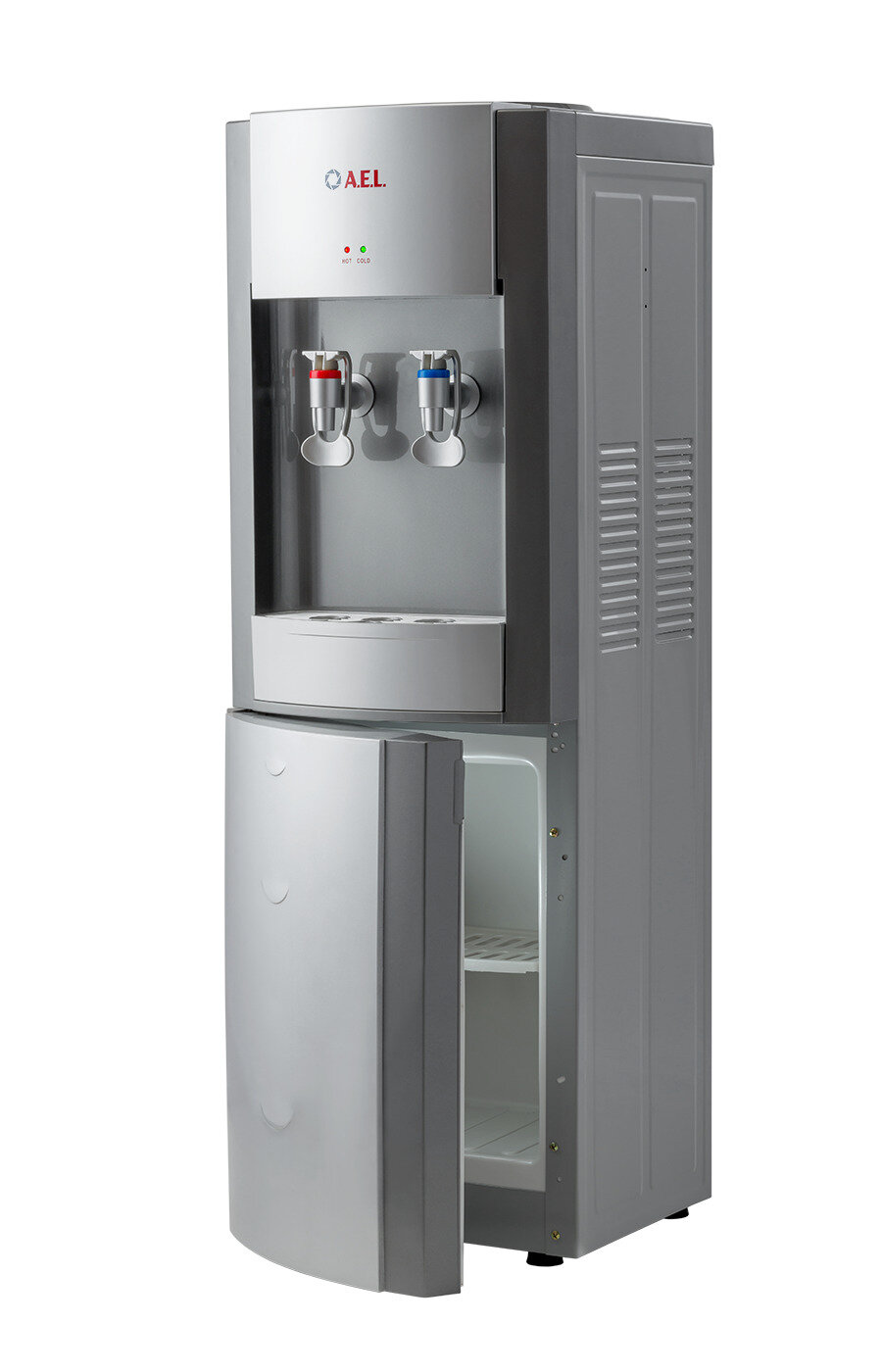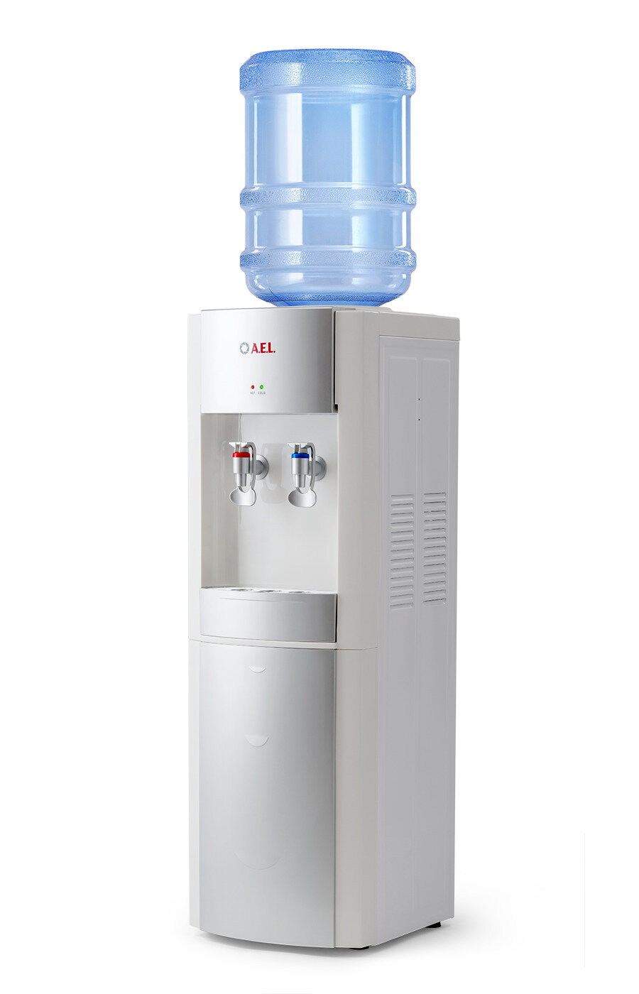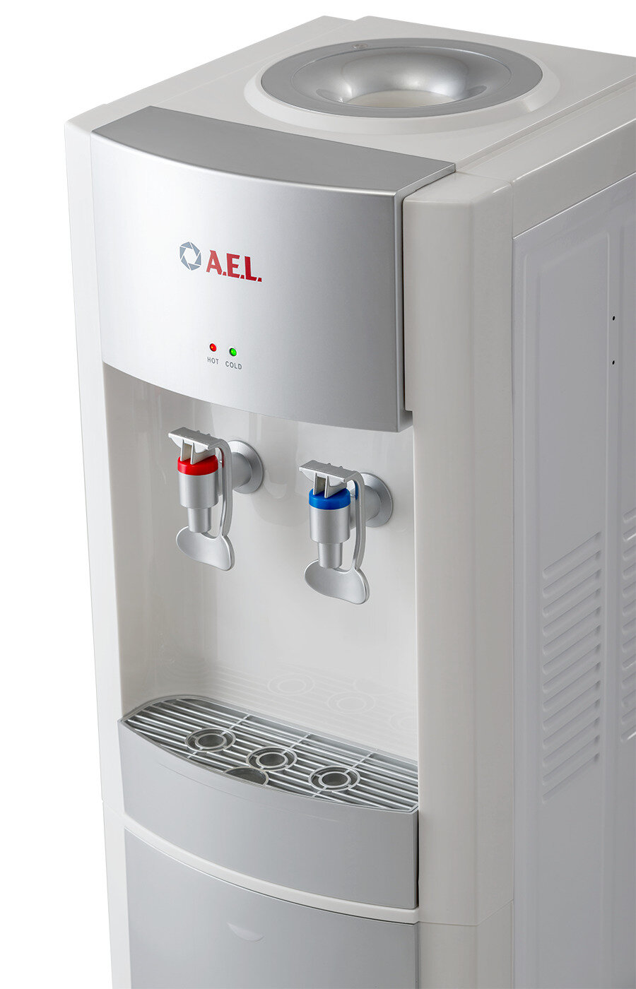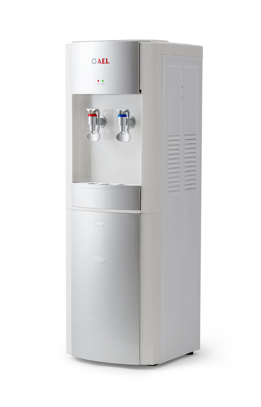 Кулер для воды AEL – устройство напольного типа размещения с электронной системой управления режимами. Он дает возможность не только нагревать жидкость, но и охлаждать ее. Выпускающий воду кран начинает работать после нажатия чашкой. Хранить кружки можно в специальном отделении. Его объем составляет 10 л.