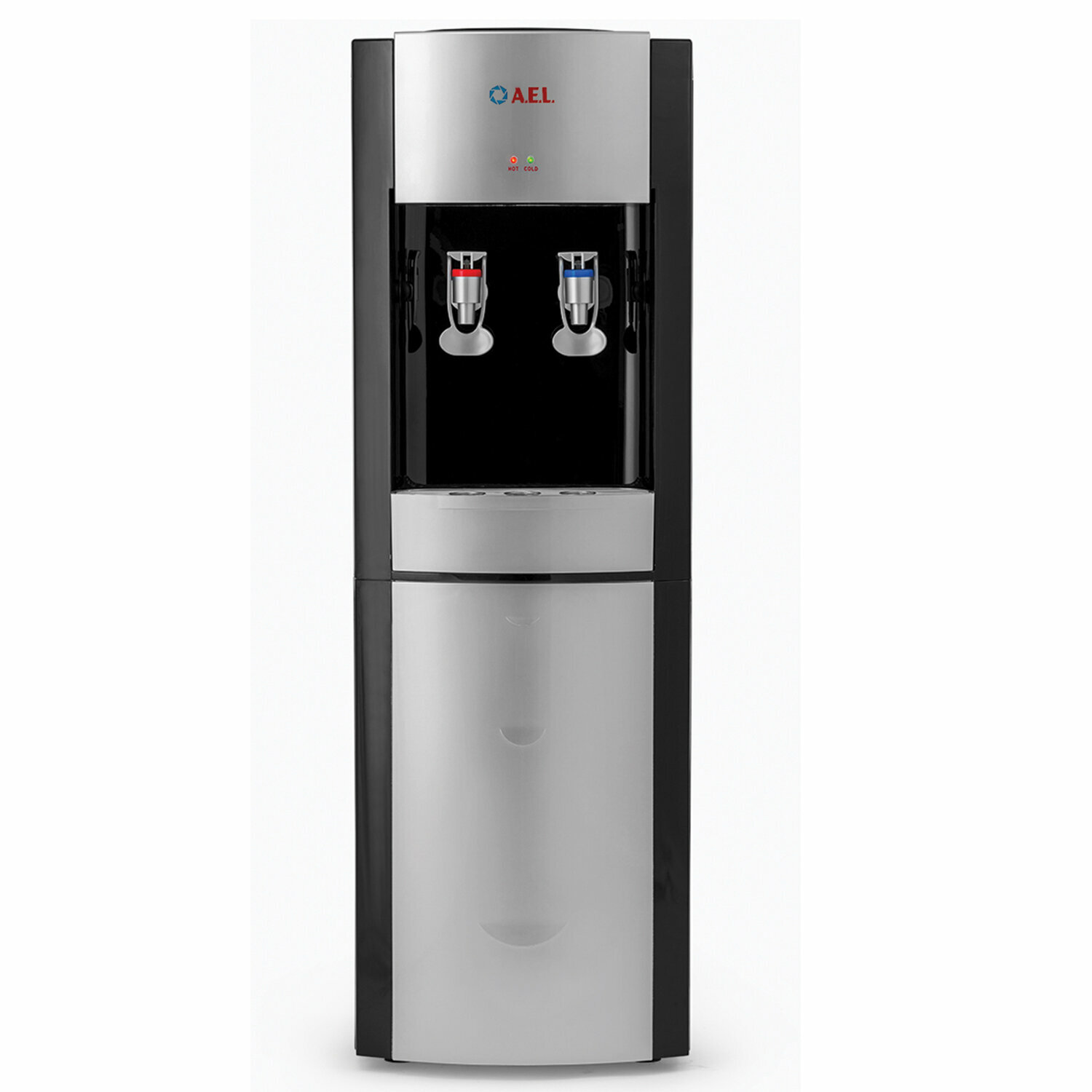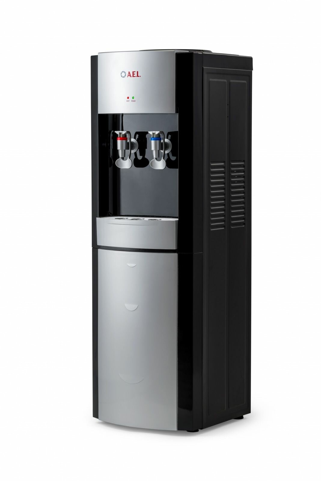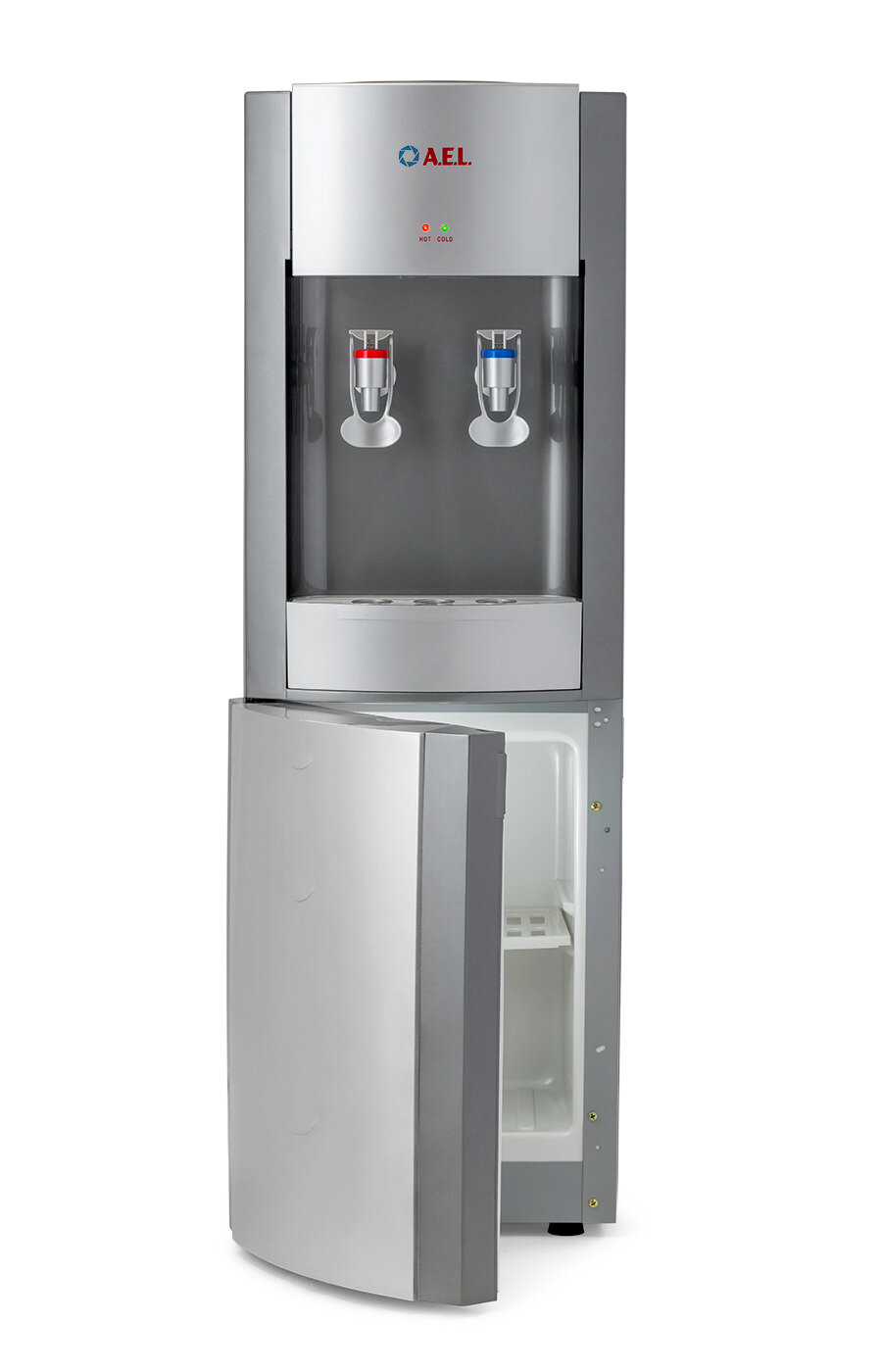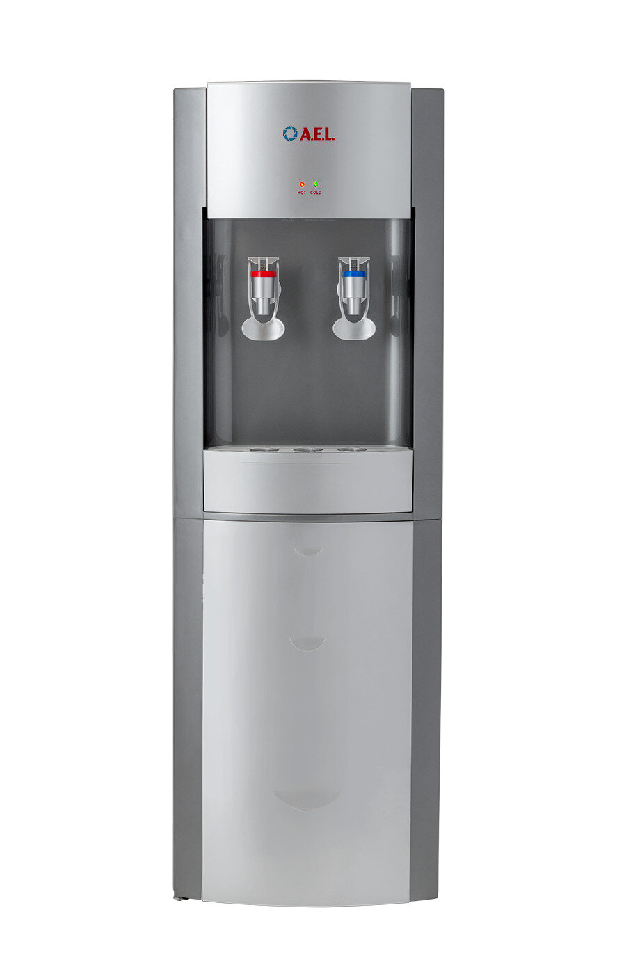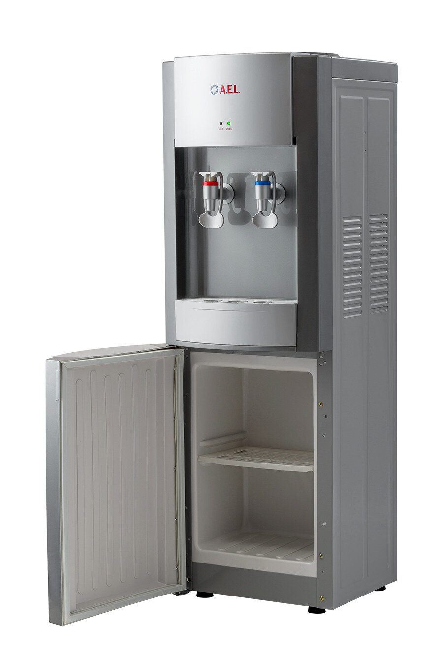 Кулер для воды AEL – устройство напольного типа размещения с электронной системой управления режимами. Он дает возможность не только нагревать жидкость, но и охлаждать ее. Выпускающий воду кран начинает работать после нажатия чашкой. Хранить кружки можно в специальном отделении. Его объем составляет 10 л.