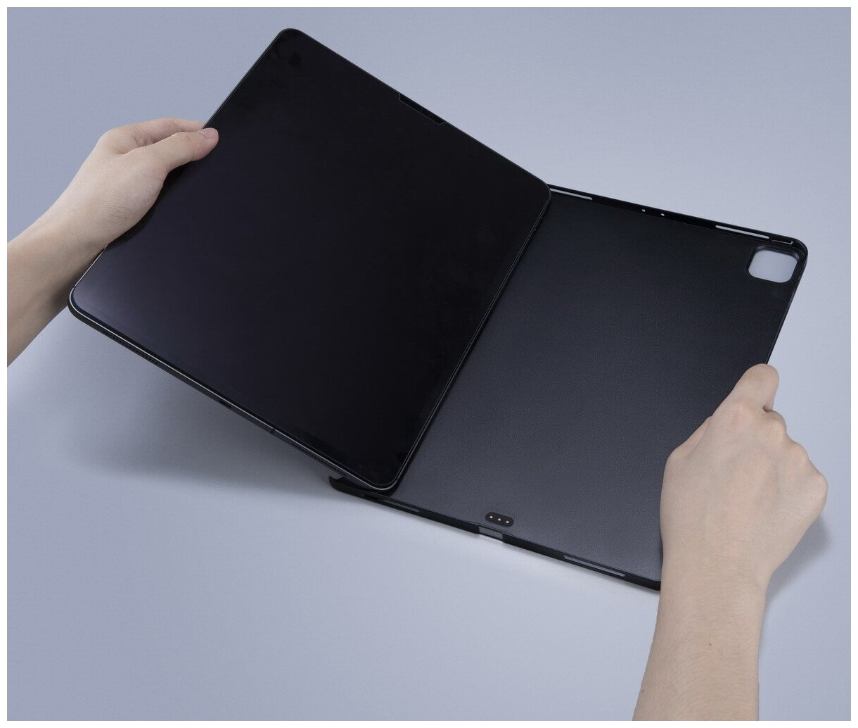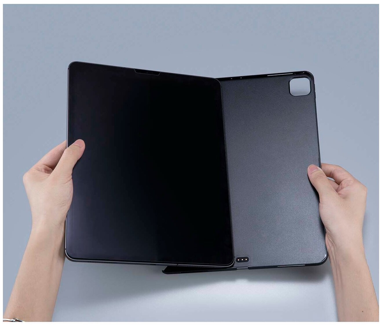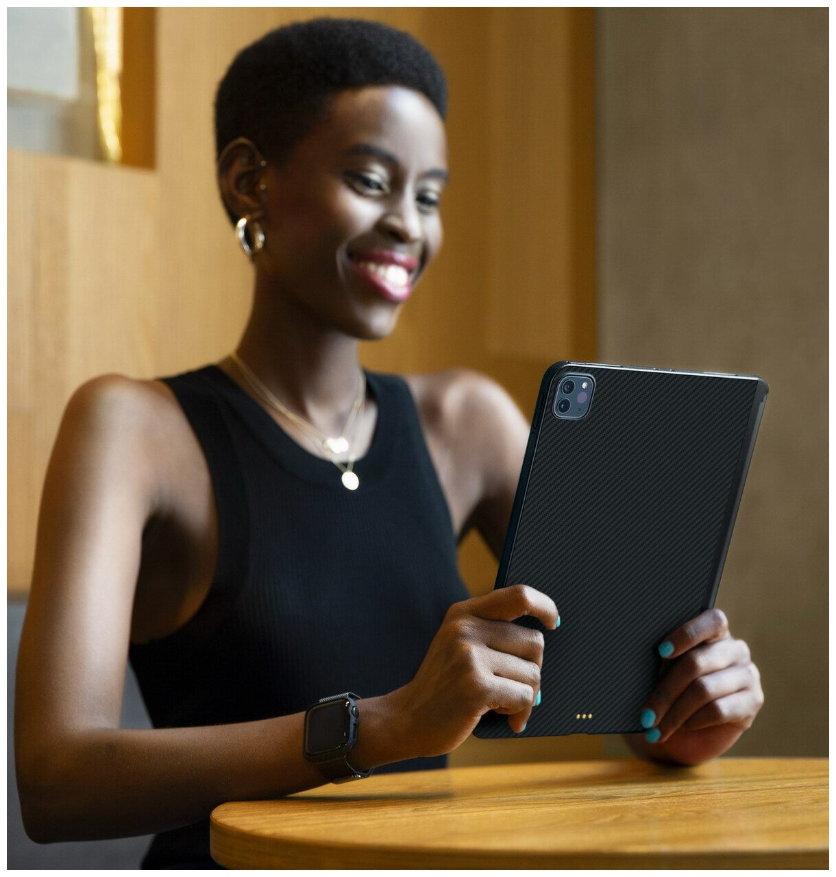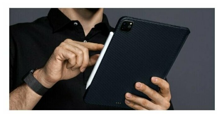 Pitaka - тонкий защитный чехол-накладка из арамидного волокна, совместимый с беспроводными зарядными устройствами и Apple Magic Keyboard. Чехол имеет приятную на ощупь текстуру, покрыт слоем Soft-touch, так что вы не захотите отпускать его из рук, и, к тому же, он абсолютно не скользкий. Металлические пластины внутри чехла расположены таким образом, что не создают помех для сигналов, а также для использования индукционных Qi зарядок. Благодаря этим пластинам планшет в чехле фиксируется на магнитные держатели без применения дополнительных наклеек.