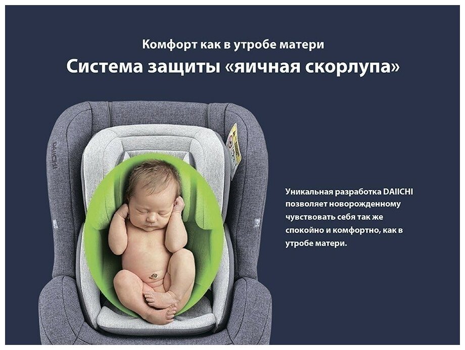 В конструкции кресла применен ряд оригинальных систем, обеспечивающих безопасность. Система "яичная скорлупа" обволакивает ребенка, защищая его от микровибрации и обеспечивая оптимальную для младенца позу. Подголовник кресла может принимать 7 различных положений, давая возможность найти максимально удобное положение для головы. Для защиты от боковых ударов реализ