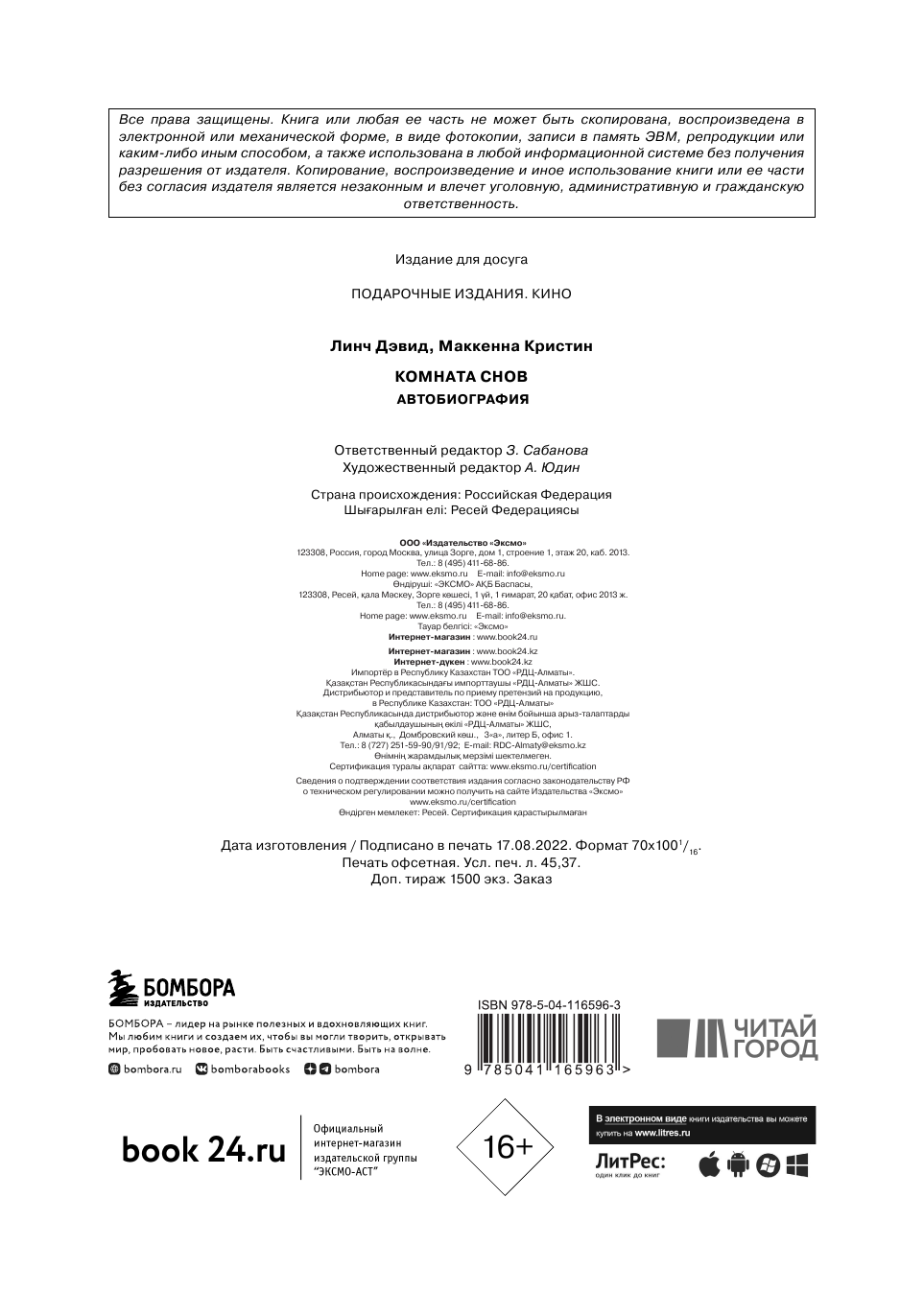 На сегодняшний день товар «Книга: Комната снов. Автобиография Дэвида Линча (Дэвид Линч, Кристин Маккенна); Бомбора, 2022» можно купить с кешбеком в 3 магазинах: book24, Яндекс.Маркет, Буквоед