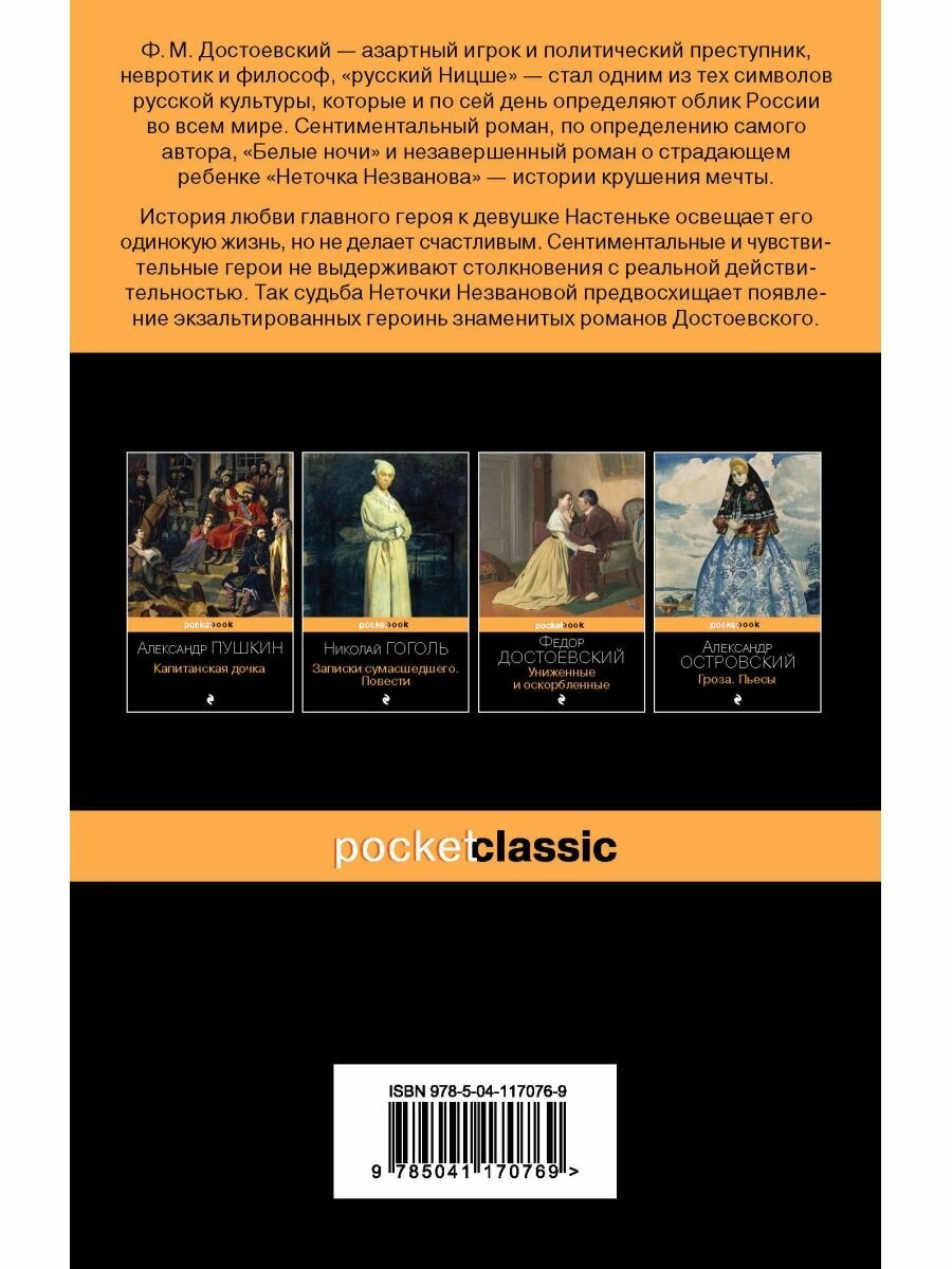 Данное произведение очень пропитано атмосферой Санкт-Петербурга, темных вечеров, чувств персонажей. Как же мне полюбилась эта история!!! Если знакомиться с Достоевским, то только с этим произведением. Оно очень легкое и атмосферное. Этот рассказик небольшой, но останешься в вашем сердечке. В скроем времени хочу познакомиться и с другими произведениями автора.