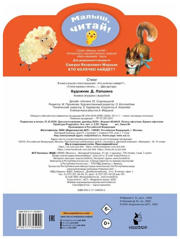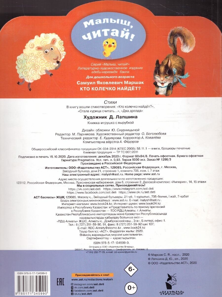 На сегодняшний день товар «Книга: Кто колечко найдет? (Маршак Самуил Яковлевич); ИЗДАТЕЛЬСТВО "АСТ", 2020» можно купить с кешбеком в 2 магазинах: book24, Буквоед