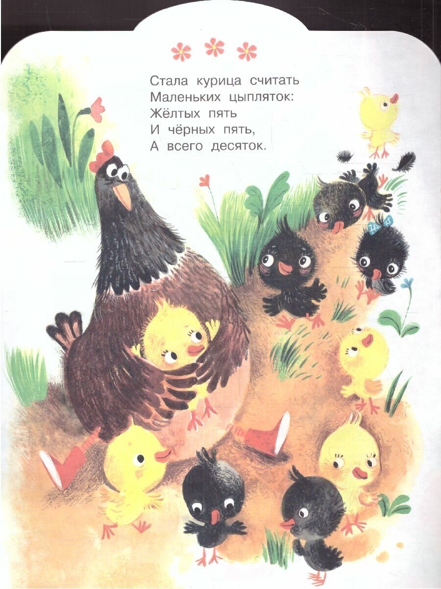 Книжка хорошая, в мягкой обложке, формата почти А4, с приятными забавными иллюстрациями художника Д. Лапшиной. Бумага средней плотности, белая, шрифт достаточно крупный, комфортный, отлично подходит для чтения старшим ребёнком младшему. В книгу вошло не только стихотворение "Кто колечко найдёт?", но и ещё три коротеньких: "У стола четыре ножки... ", "Стала курица считать...", "Два дрозда".
