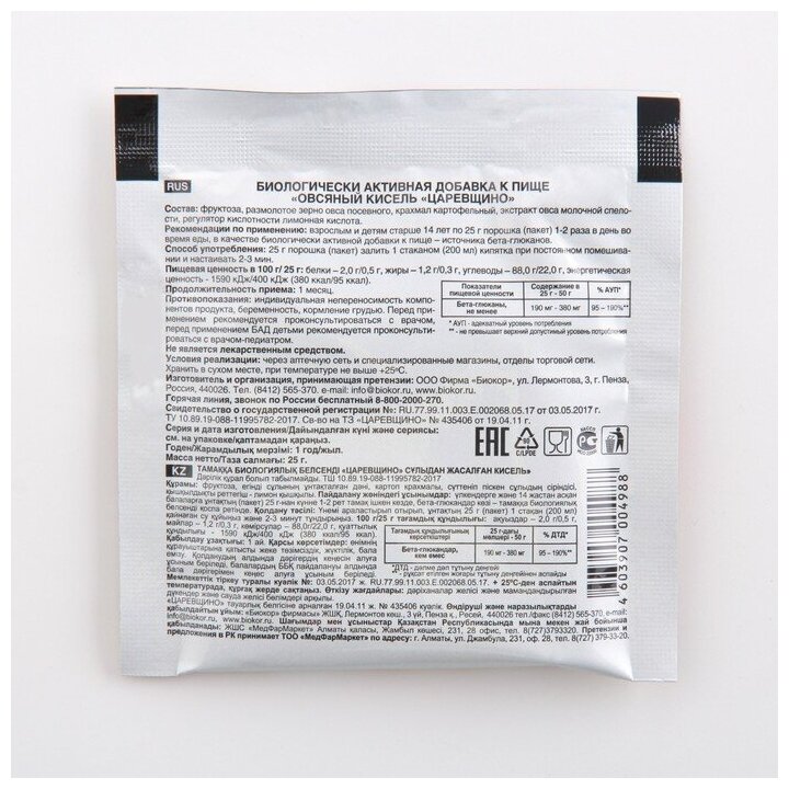 Кисель овсяный царевщино биокор 25 г (1237487)