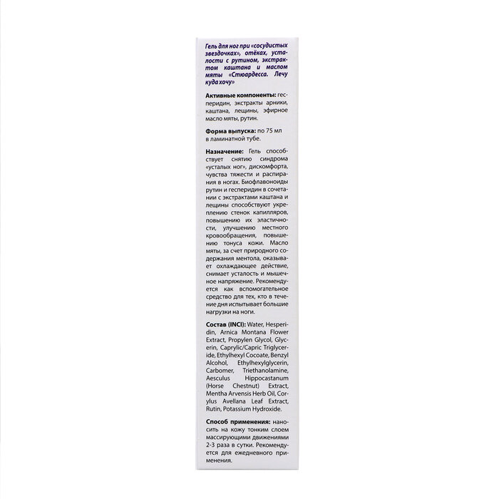 Сервис сравнения цен СкидкаГИД предлагает сравнить цены на товар «Гель для ног при "сосудистых звездочках" "Стюардесса. Лечу куда хочу" туба 75мл ВИС ООО (487742)»