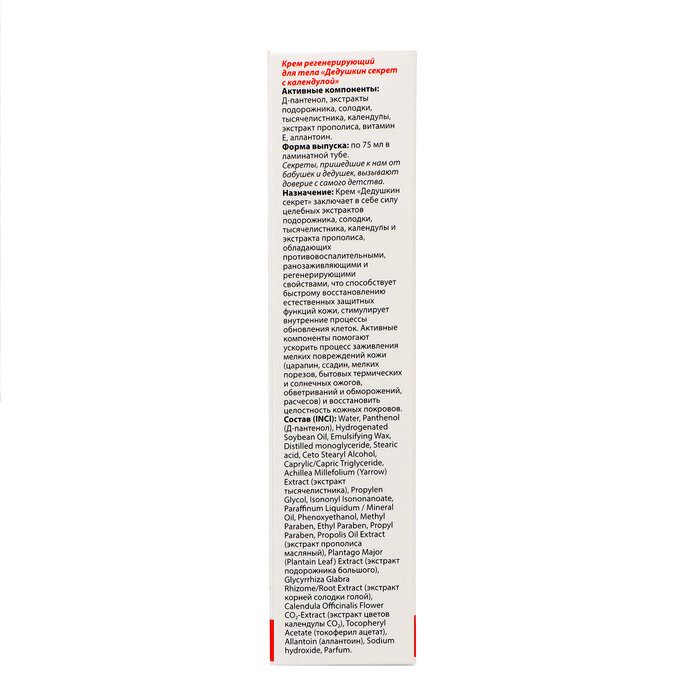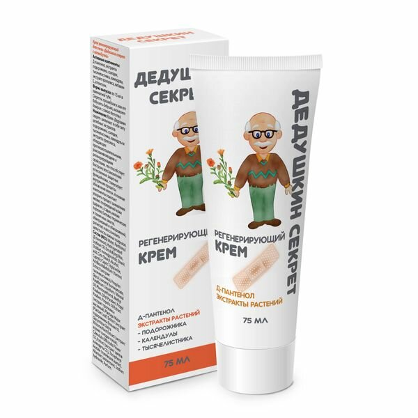 Крем "Дедушкин секрет" заключает в себе силу целебных экстрактов подорожника, солодки, тысячелистника, календулы и экстракта прополиса, обладающих противовоспалительными, ранозаживляющими и регенерирующими свойствами, что способствует быстрому восстановлению естественных защитных функций кожи, стимулирует внутренние процессы обновления клеток. Активные компоненты помогают ускорить процесс заживления мелких повреждений кожи (царапин, ссадин, мелких порезов, бытовых термических и солнечных ожогов, обветриваний и обморожений, расчесов) и восстановить целостность кожных покровов. Способ применения: Наносить крем на проблемные участки кожи тонким слоем 1-2 раза в день. Противопоказания: индивидуальная непереносимость компонентов.