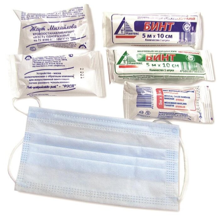 Состав аптечки Жгут кровоостанавливающий.Бинт марлевый нестерильный 3 м × 10 см или 5 м х 10 см. Бинт марлевый стерильный 3 м × 5 см или 5 м × 5 см. Бинт марлевый стерильный 3 м × 10 см или 5 м × 10 см. Устройство для проведения искусственного дыхания.