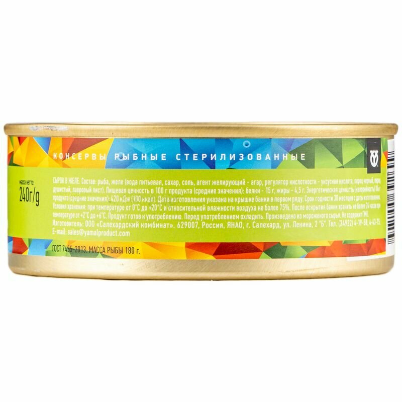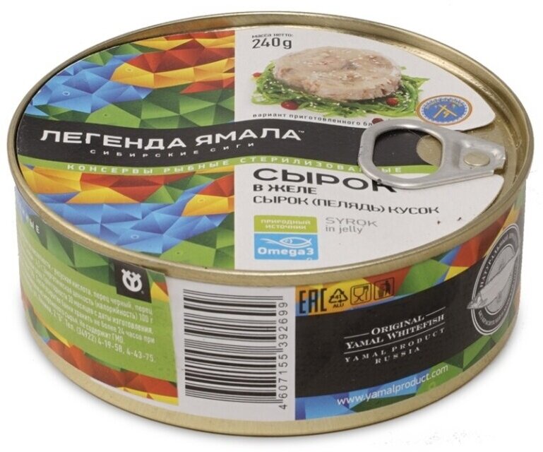 "Yamal Product" - одна из самых крупных компаний по глубокой переработке рыбы в России. Находится в Салехарде - единственном городе на планете расположенном на широте Северного полярного круга."Легенда Ямала" - отборный , лучший продукт Ямала, рецепт которого передается из поколения в поколение как сокровище."Легенда Ямала" - это экологически чистый продукт, что особенно ценно в условиях повсеместного использования технологий по искусственному выращиванию. Это любимый продукт по доступной цене. Это гарантировано высокое качество от производителя. Эта рыба обладает плотным, нежным мясом, содержащее большое количество витаминов, необходимых для полноценной работы человеческого организма. Наделенный исключительно богатым вкусом сырок в желе- незаменимое блюдо вашего стола.
